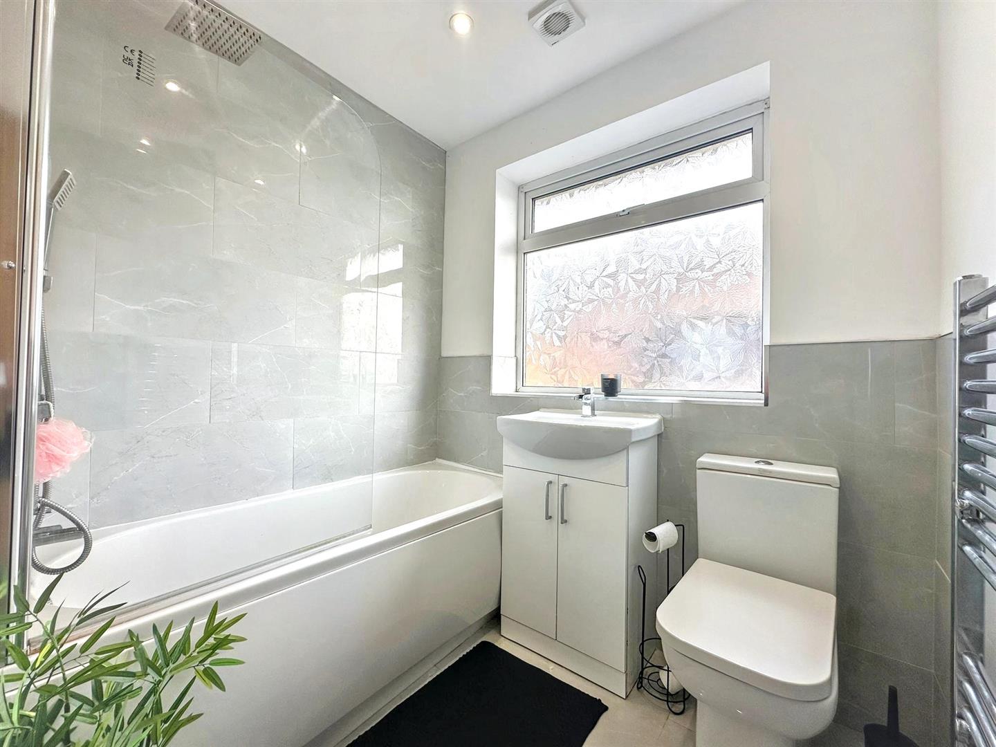 Fitted with a suite comprising of, low-level WC, vanity wash hand basin and bath with rainfall shower over. Tiled flooring. Heated towel rail. Cupboard housing the gas combination boiler. Obscured uPVC window. Inset spotlights.