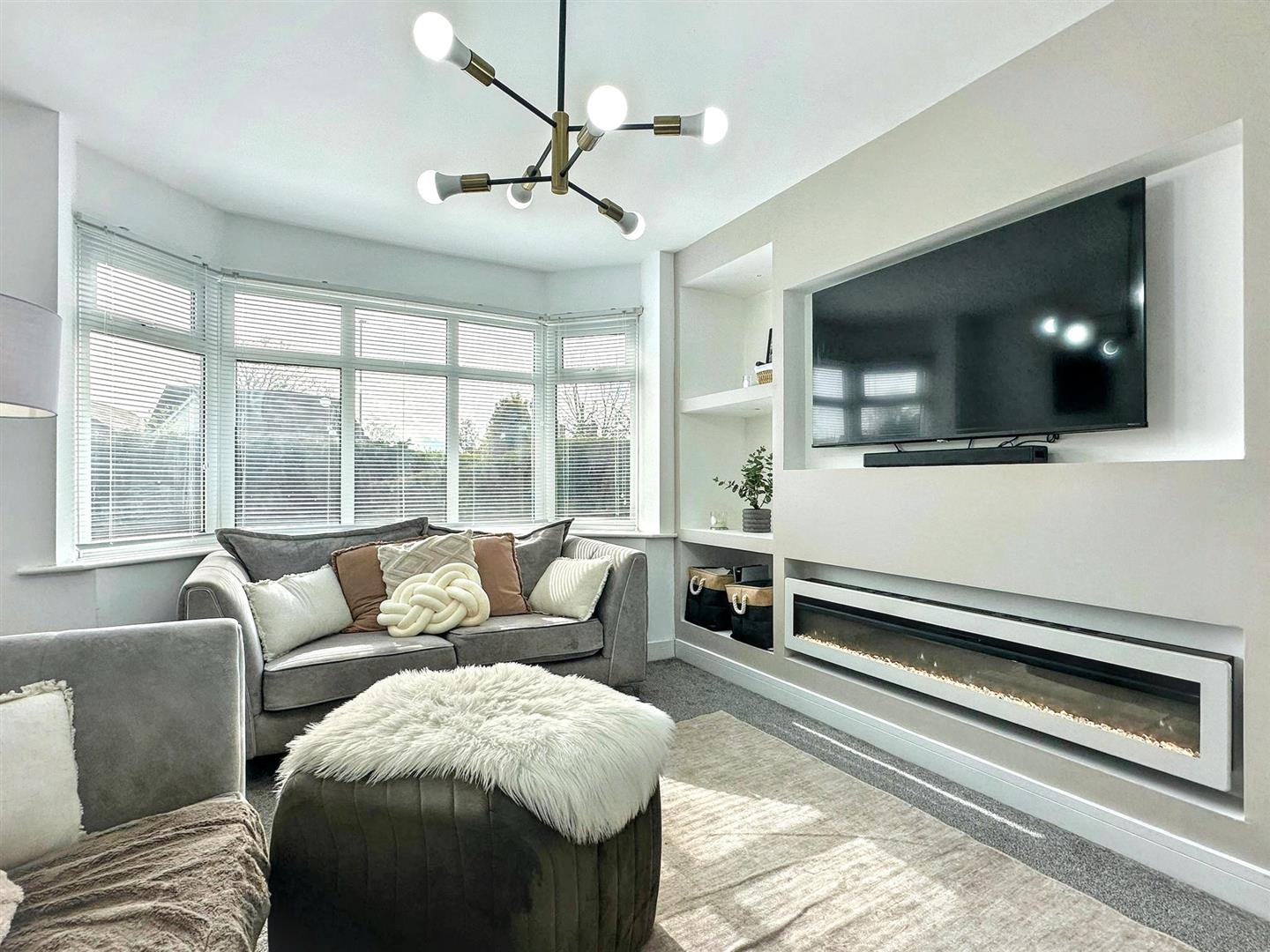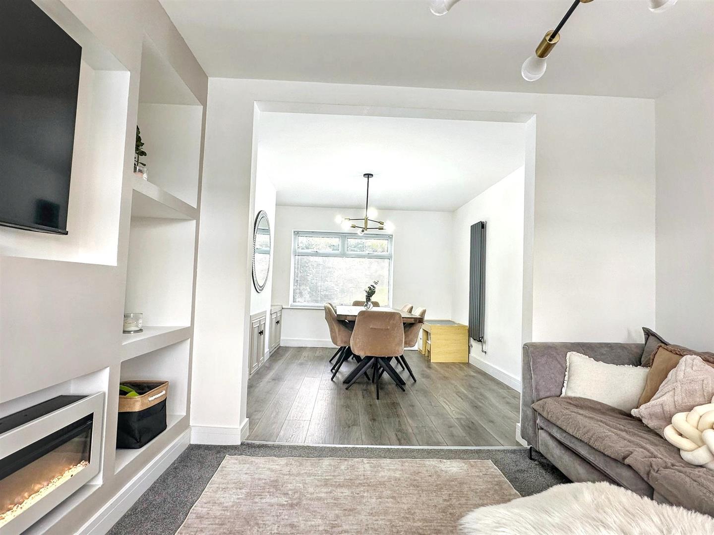 The heart of the home is the bright and airy open-plan lounge/dining area, offering a generous and flexible living space perfect for both relaxing and entertaining. The lounge area features a stylish contemporary media wall with an integrated electric feature fire, creating a focal point that enhances the overall modern aesthetic. A bay window to the front aspect allows natural light to flood the room.
