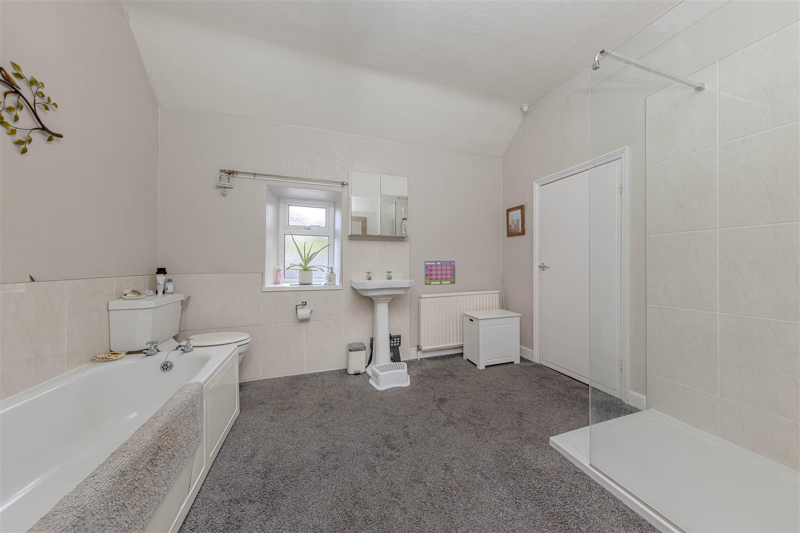 Fitted carpet. Wall mounted radiator. Pedestal style wash hand basin. WC. Bath. Walk-in shower. Separate shower cubicle with electric shower. Obscured UPVC double glazed window. Ceiling light.