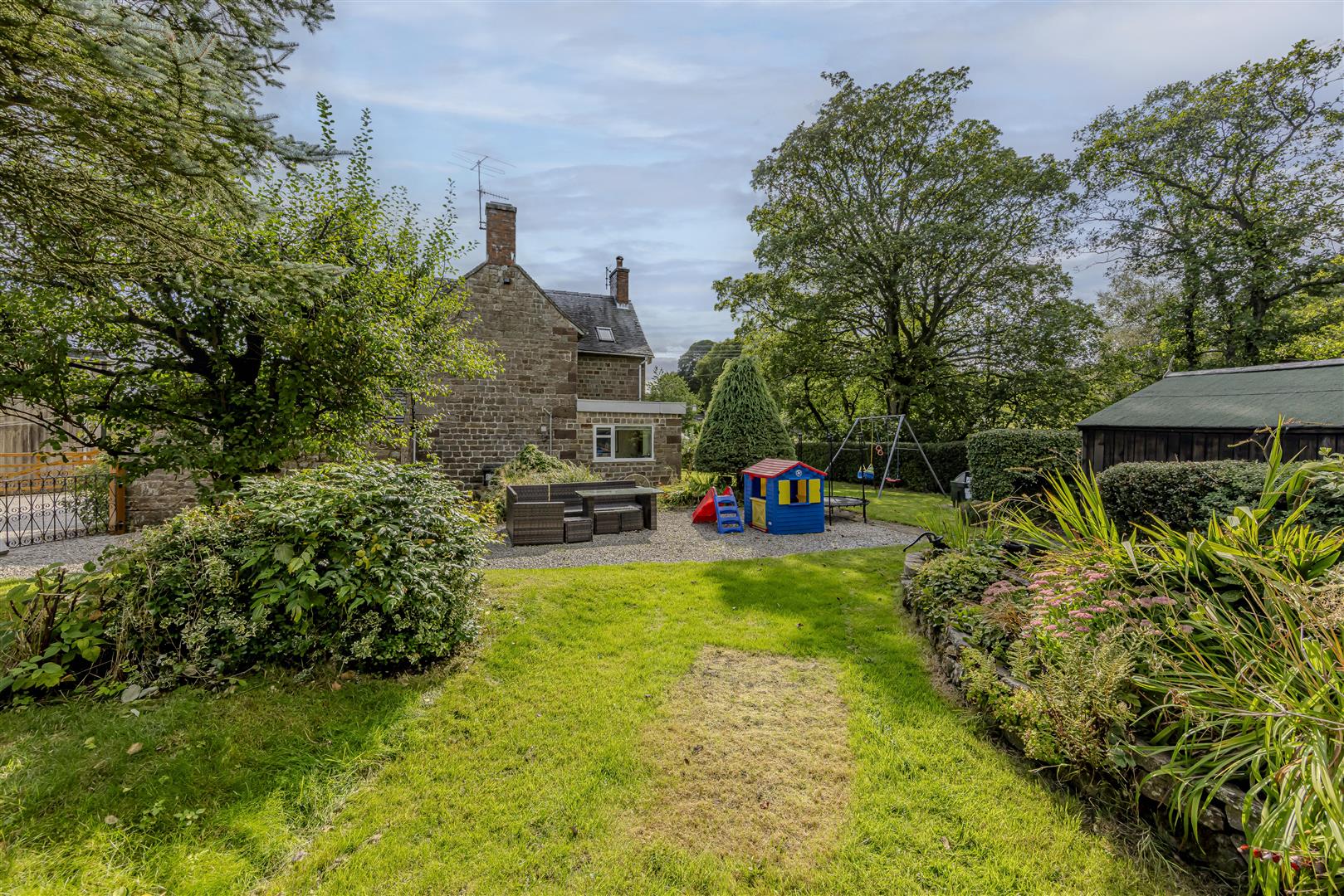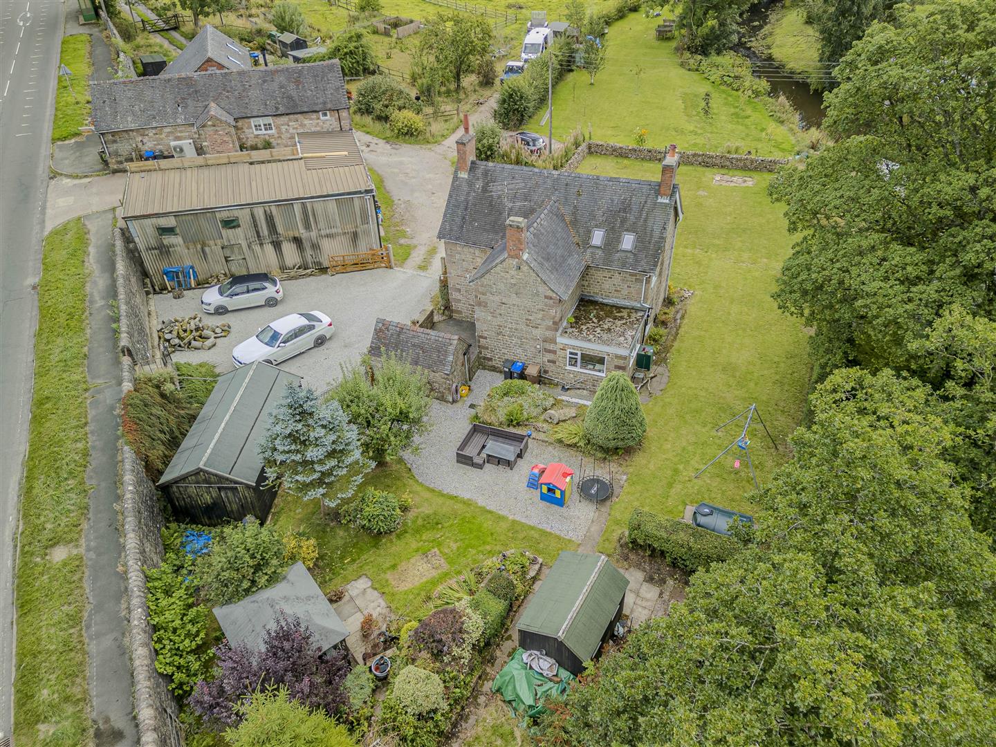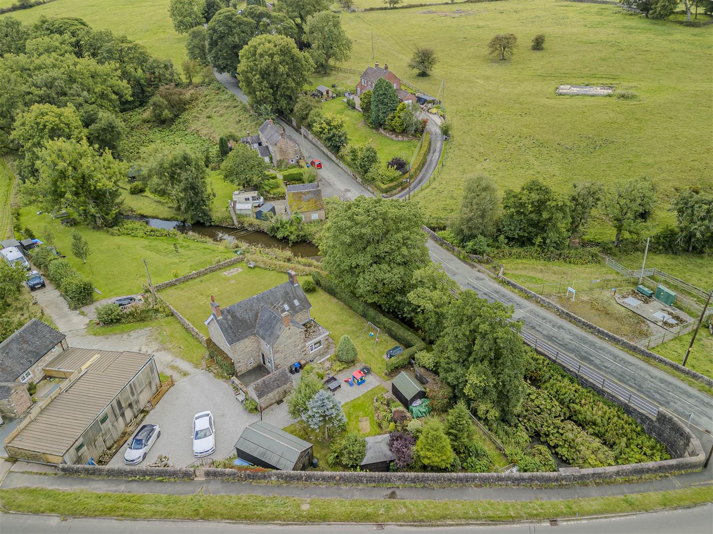 Accessed via a shared driveway, this property boasts gated entry to generous off-road parking and a garage. Set on a spacious plot, the garden features lush lawns framed by traditional dry stone walls and natural hedging, perfectly complementing its countryside charm. With two wooden outbuildings and proximity to the Hamps River, you'll also enjoy fishing rights, adding to the appeal of this outdoor space.