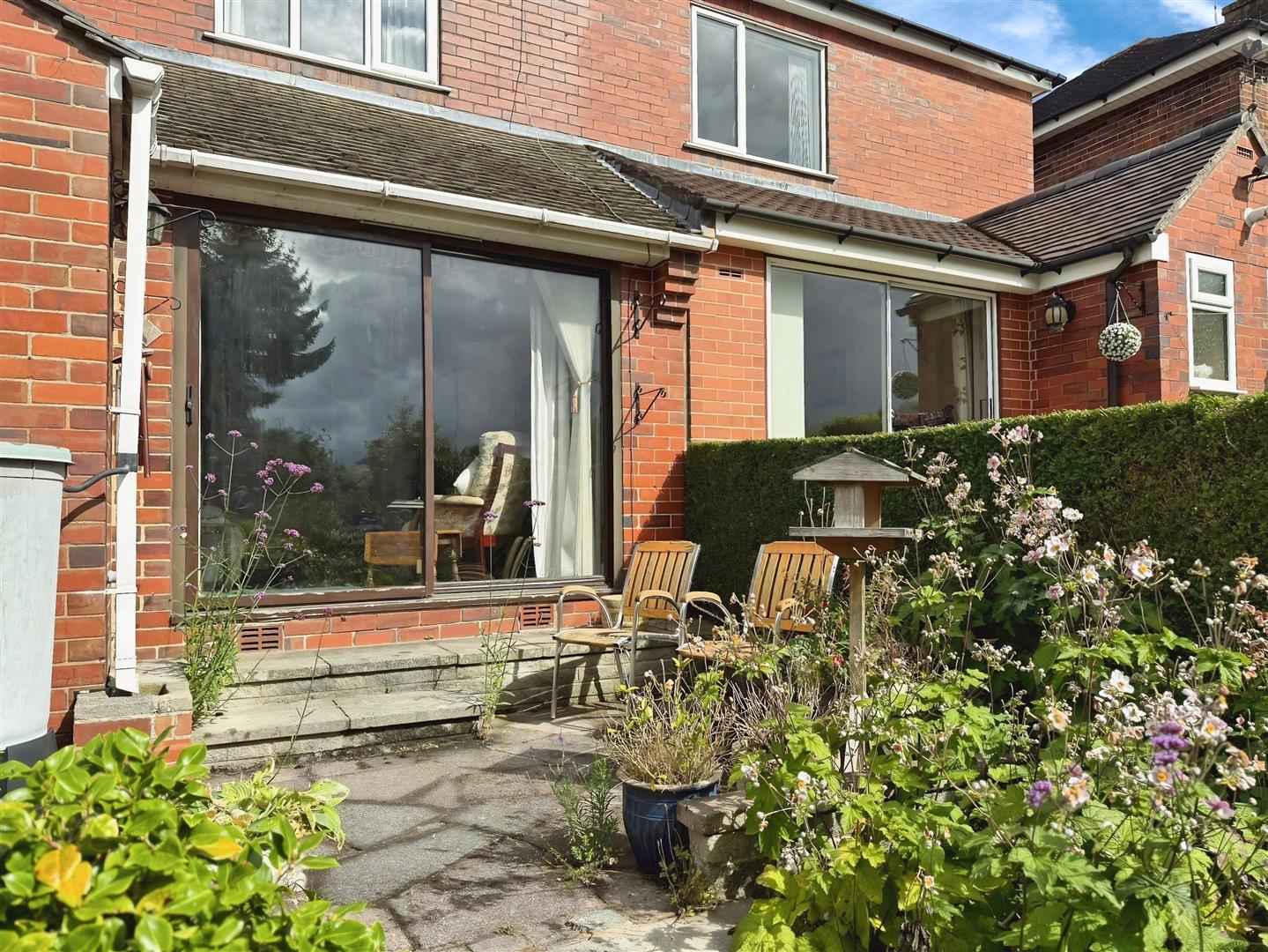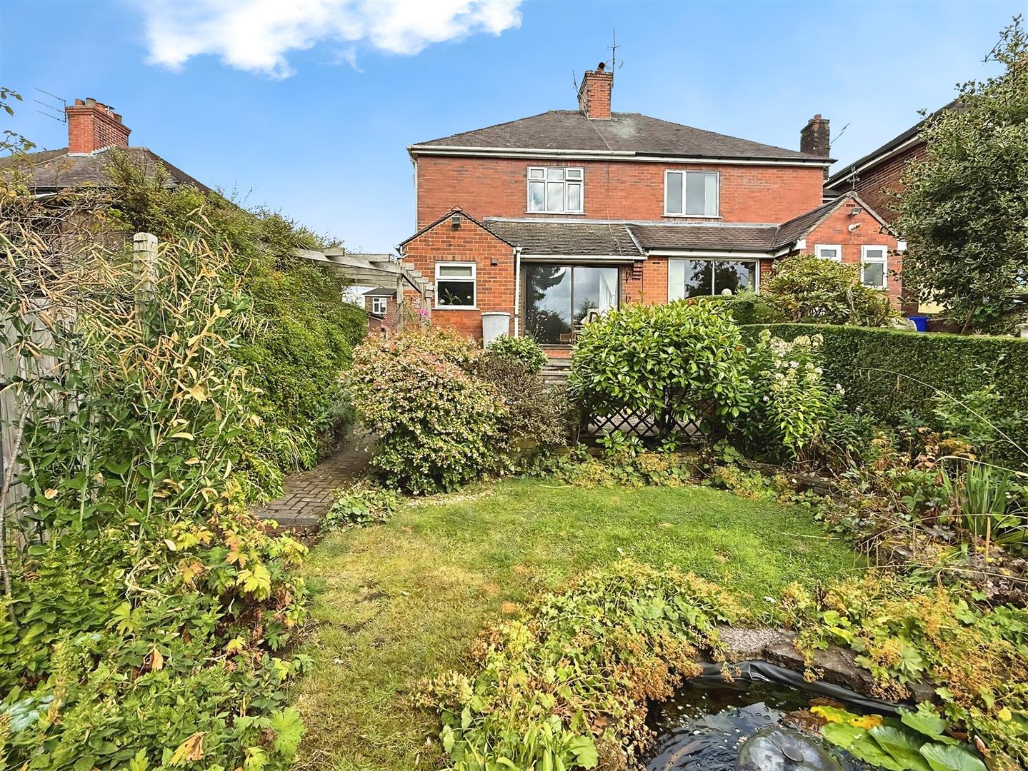 Externally, the property is set within a generous plot. A block-paved driveway provides off-road parking and gives access to a detached single garage. The rear garden is a particular feature – private and enclosed, well-stocked with mature shrubs and bushes, offering paved pathways, seating areas, and a charming small fishpond.