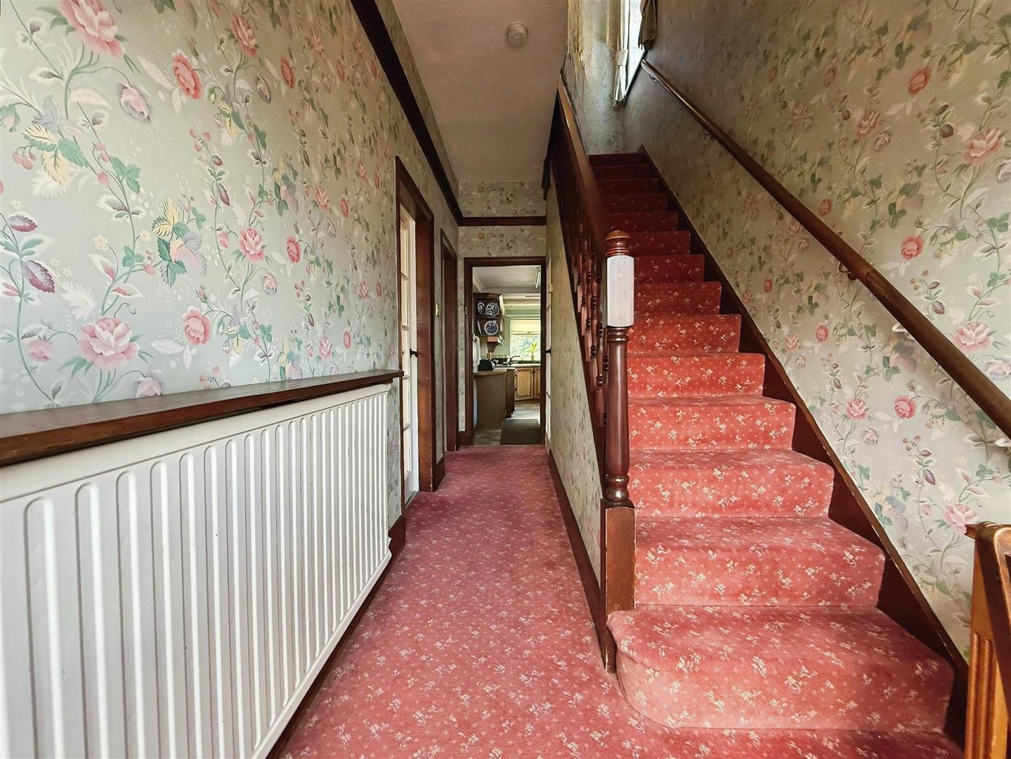 Fitted carpet. Wall mounted radiator. Stairs leading to first floor. Ceiling light. Doors leading into:-