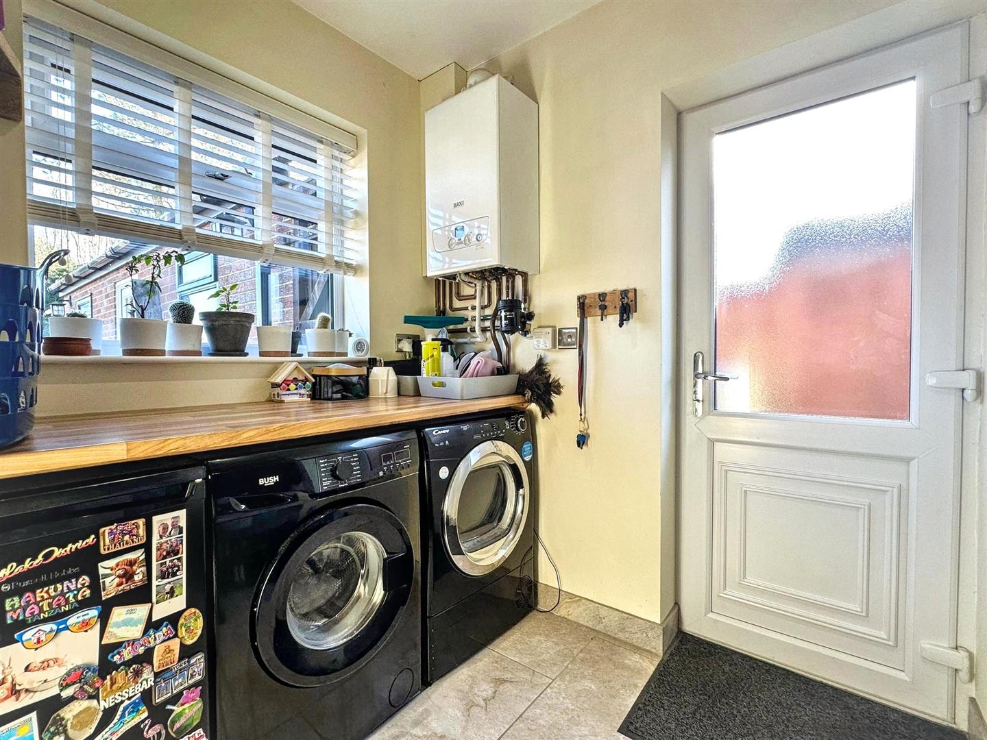 Leading off the kitchen is a practical utility room, providing additional storage and space for appliances, including plumbing for a washing machine and room for a dryer.