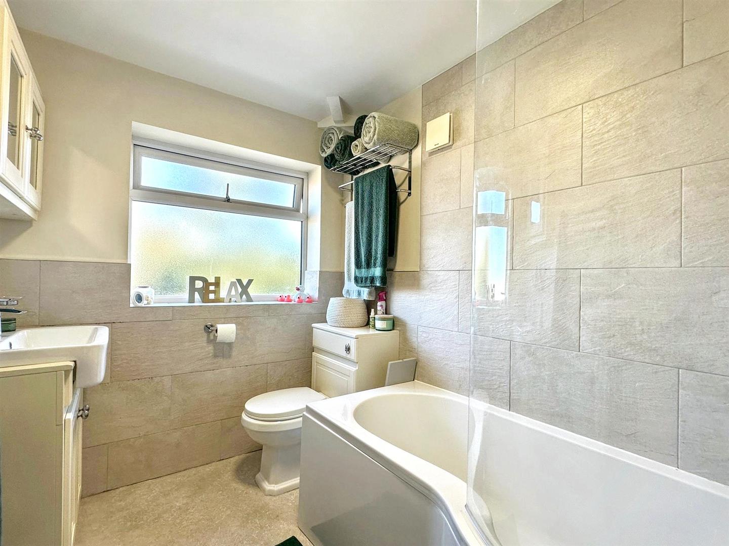 Fitted with a suite comprising of, low-level WC, vanity wash hand basin, and 'P' shaped bath with rainfall shower over. Tiled flooring. Part tiled walls. Wall mounted heated towel rail. Obscured uPVC window to the rear aspect. Ceiling light.