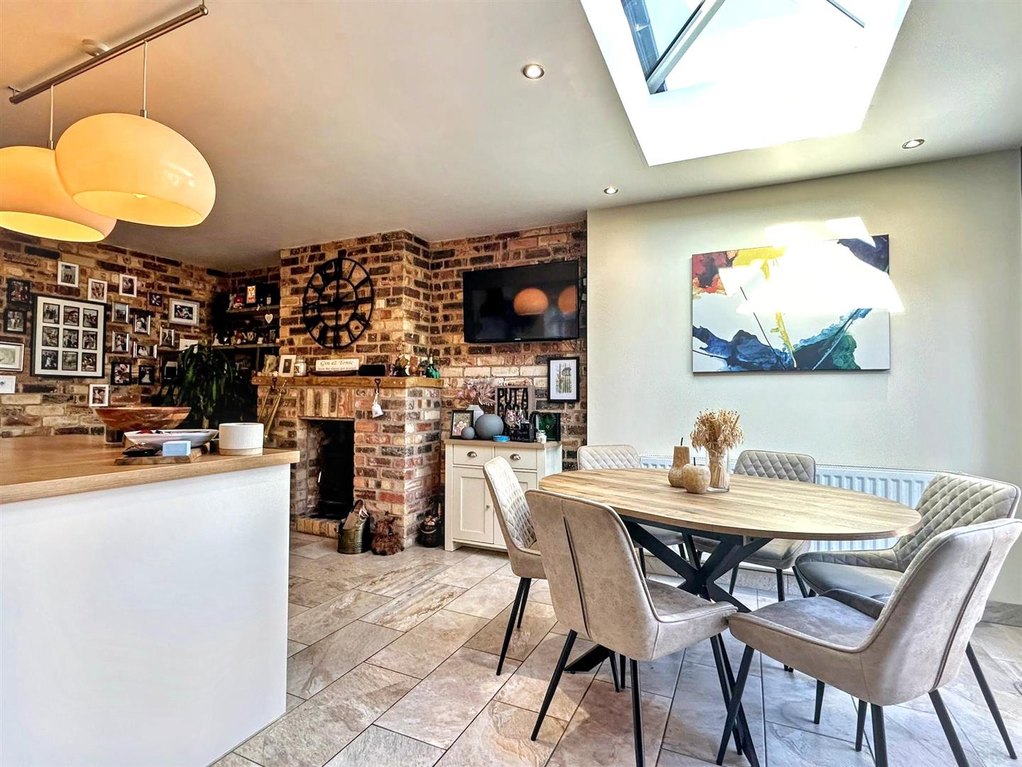 To the rear of the property lies the standout feature of the home: a superb open-plan kitchen diner. This impressive space offers a well-finished kitchen area alongside a spacious dining and entertaining area. A characterful log burner set against an exposed brick fireplace adds charm and warmth, while a skylight enhances the sense of space and light. Double doors open directly onto the rear garden, seamlessly blending indoor and outdoor living.
