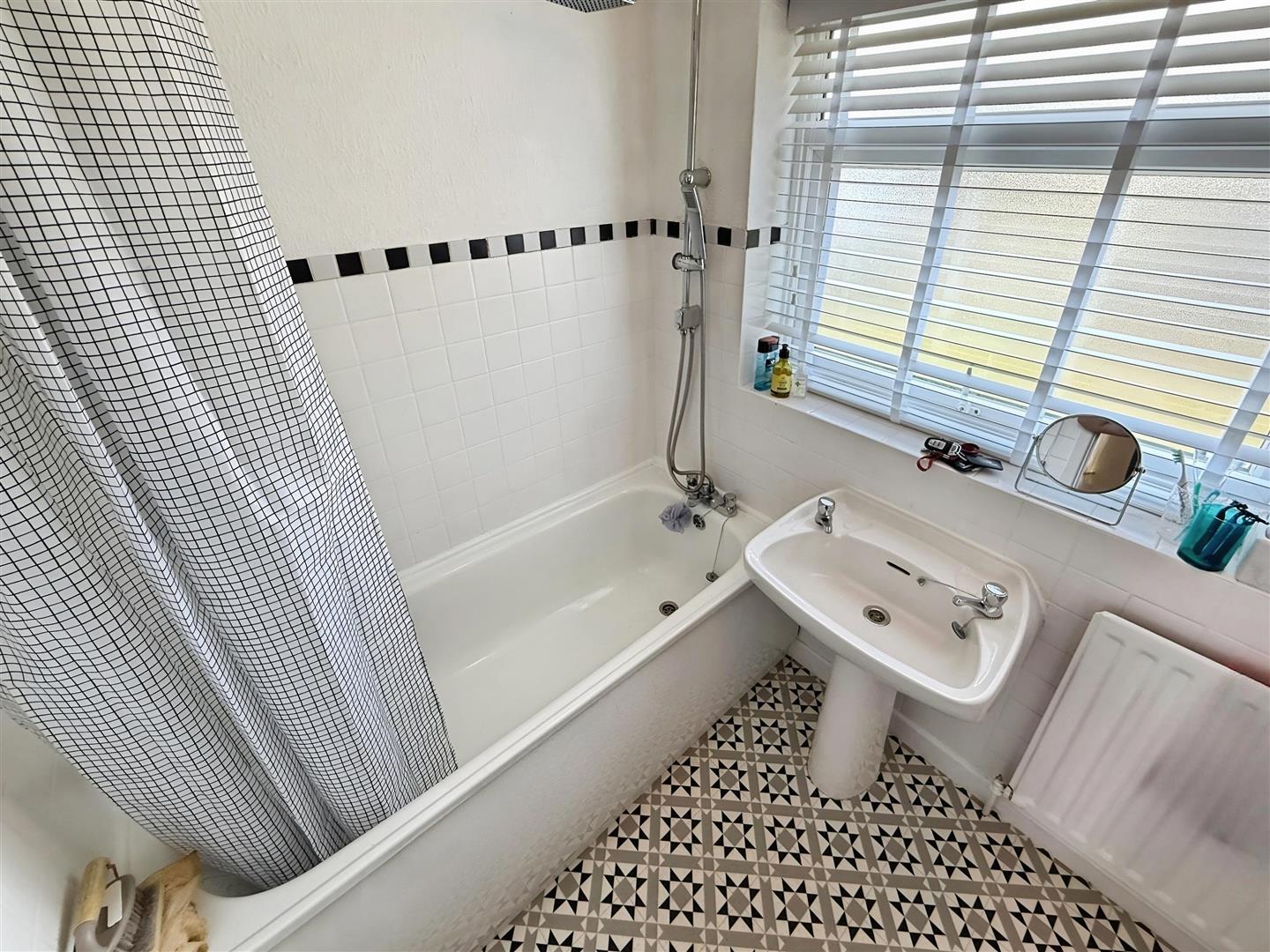 Vinyl flooring. Wall mounted radiator. Pedestal style wash and basin. WC. Bath tub with shower attachment and rain style shower. Obscured double glazed window. Ceiling light.