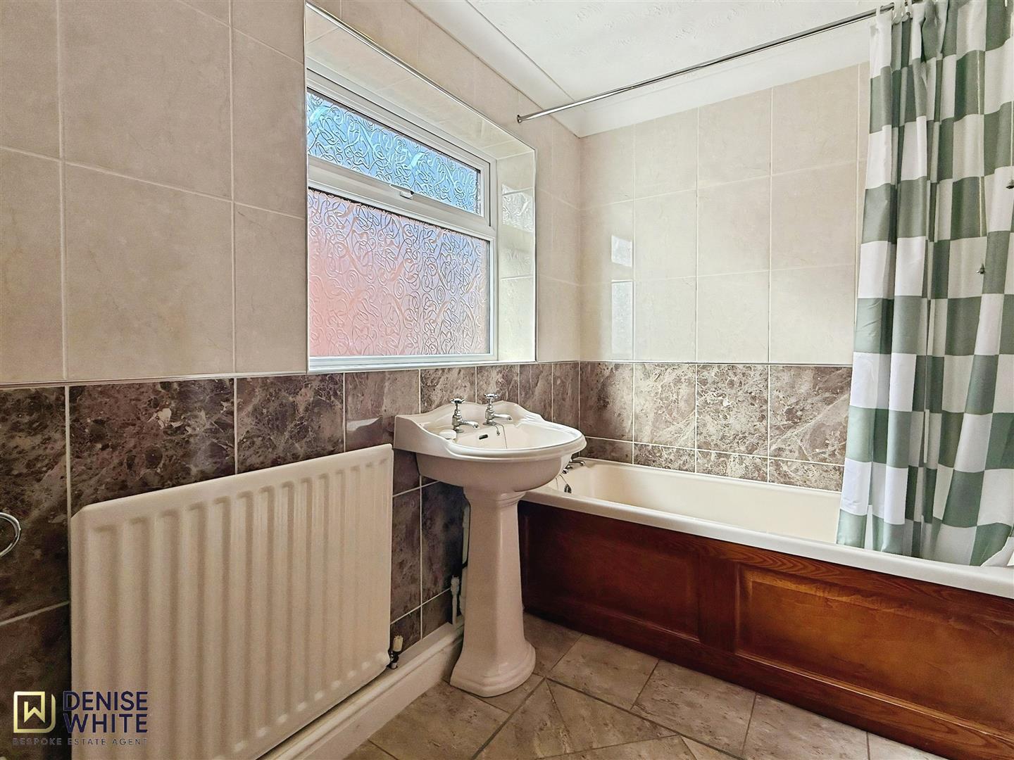 Tiled flooring. Wall mounted radiator. WC. Pedestal style wash handbasin. Bath. Electric shower. Obscured UPVC double glazed window. Ceiling light.