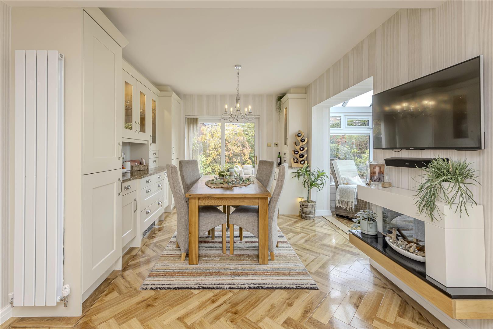 Transitioning into the dining area, the amtico flooring continues, and the space is enhanced by a contemporary wall-mounted radiator. The fitted units in the dining area mirror the kitchen’s cream design and granite work surfaces, featuring pull-out drawers, display shelving, and additional storage. Sliding UPVC patio doors lead to a side seating garden area, while a central light fixture, a wall mounted fire surround and a contemporary-style radiator create an inviting atmosphere.