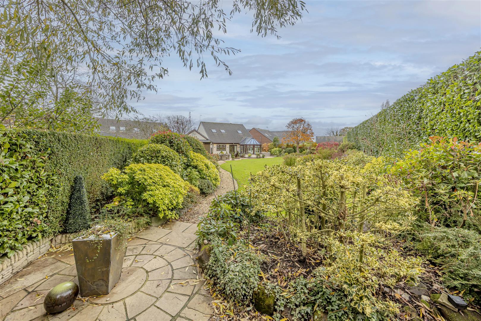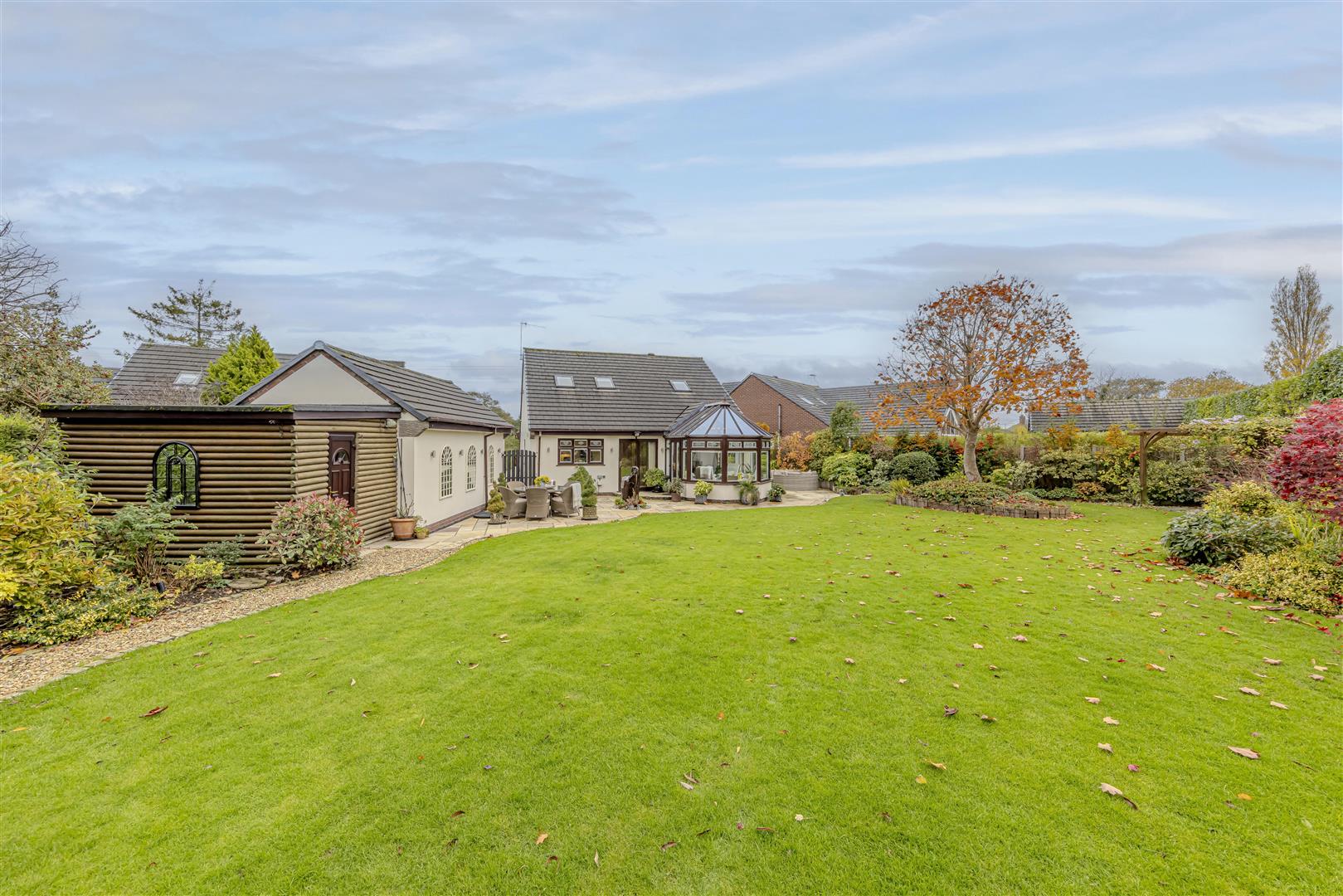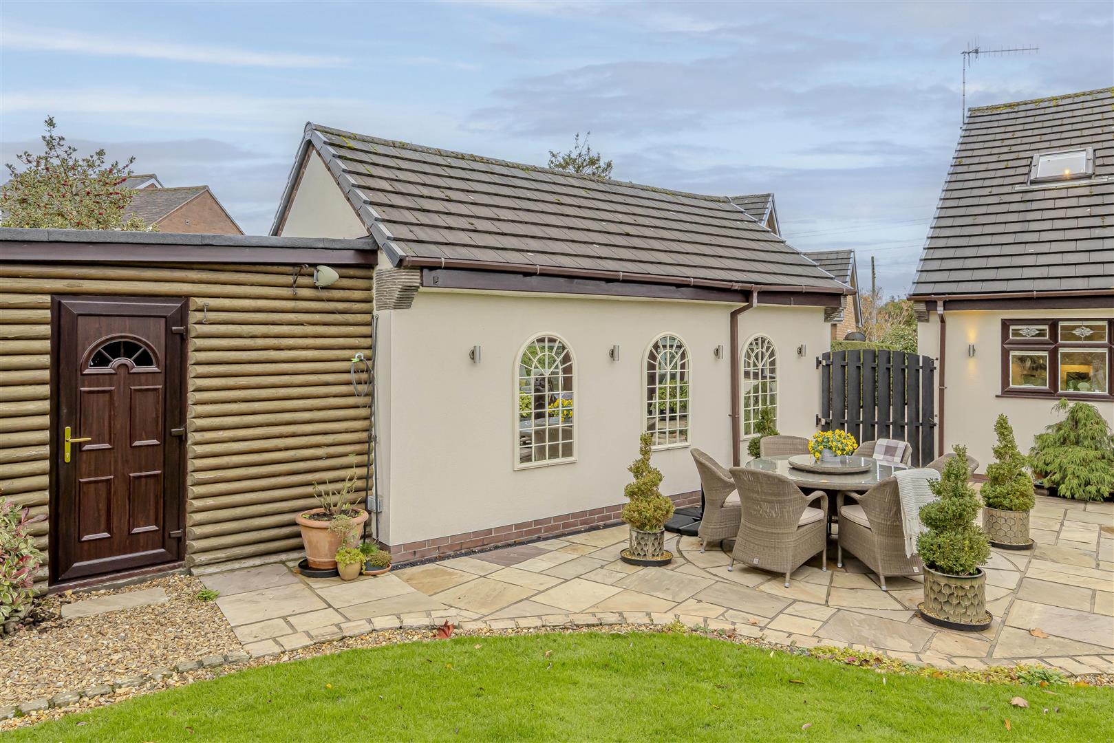 This property is set on an impressive plot that has been beautifully landscaped by the current owners. A long cobblestone driveway, secured by electric gates and complemented by security lighting, leads up to the property, providing ample parking space and access to the detached garage. The driveway is bordered by neatly maintained hedges, extensive flower beds, and lush lawn areas. The detached garage has an electric up and over door provides ample space to house a car and has an additional utility style area at the rear with wall and base units, tiled flooring and storage space.
