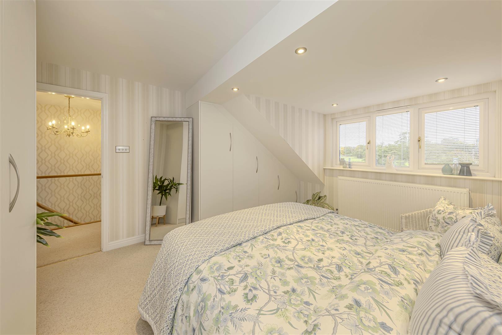 This generous double bedroom features UPVC double-glazed windows to the front aspect, complete with integrated blinds for added privacy. Fitted wardrobes consist of two doubles and one single on one wall, with three additional storage cupboards on the opposite wall. The room has a fitted carpet, inset spot lighting, and a dimmer switch controlled from the landing. Additional storage space is available in a walk-in area that houses the wall-mounted central heating boiler, along with shelving in the eaves.