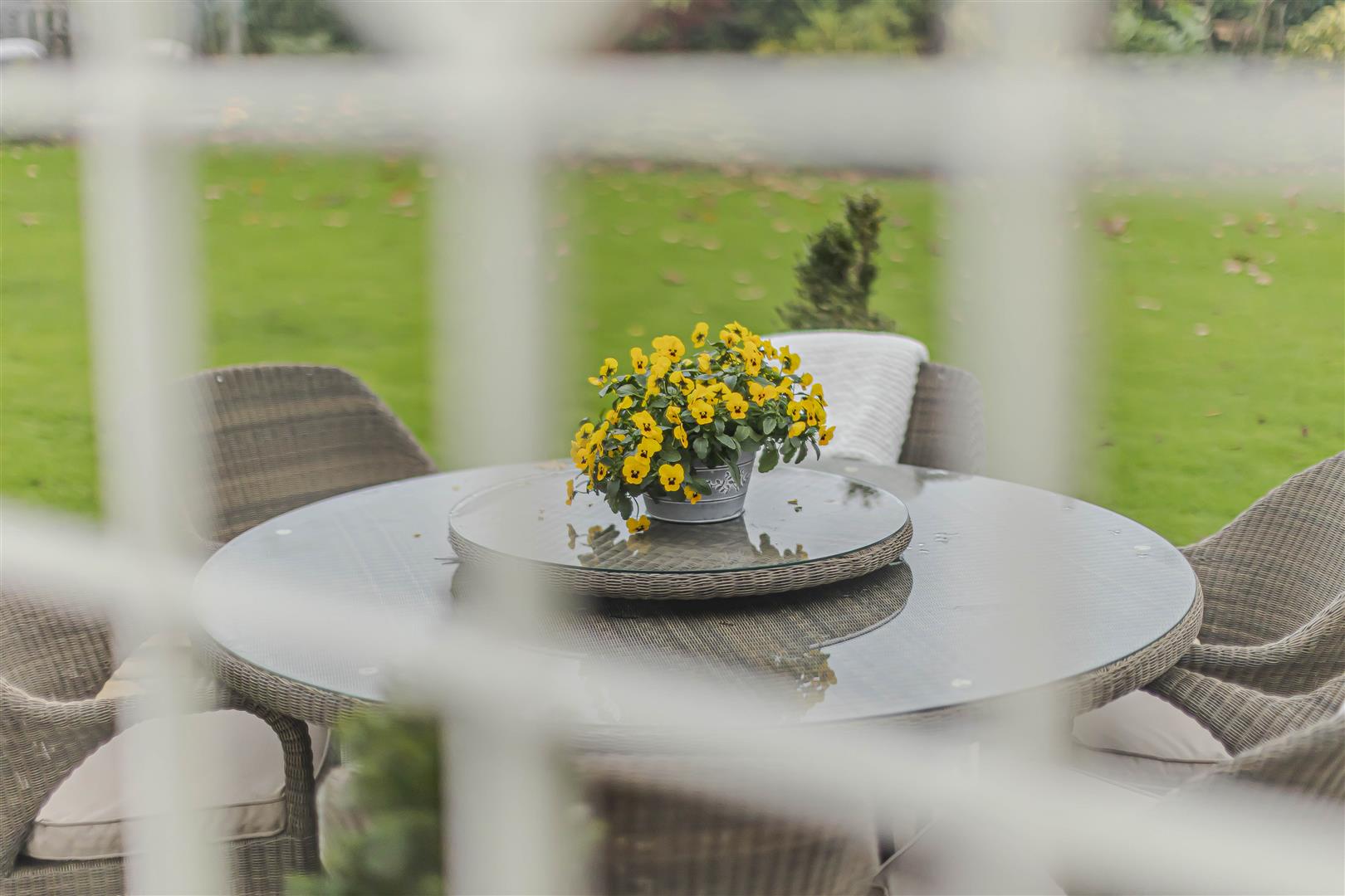 The main kitchen area is outfitted with an extensive range of cream wall and base units, complemented by granite work surfaces. Key features include a centrally located Villeroy and Boch Belfast-style sink unit with a Quooker tap and rinser. Along with a NEFF gas hob and a extractor hood over with concealed lighting under the units. The kitchen also offers adequate pan drawers, an integrated dishwasher, an integrated NEFF double oven with an eye-level NEFF microwave, and an integrated fridge freezer, ensuring functionality and convenience. A pull-out pantry and display cabinet enhance the storage options. A UPVC double-glazed window above the sink provides a lovely view of the rear garden, with the uPVC sliding patio doors leading out to the rear garden space.