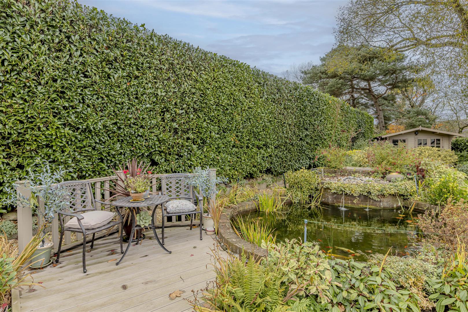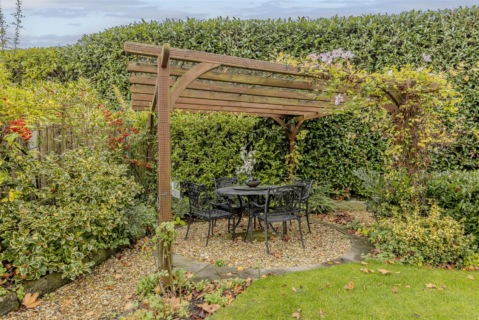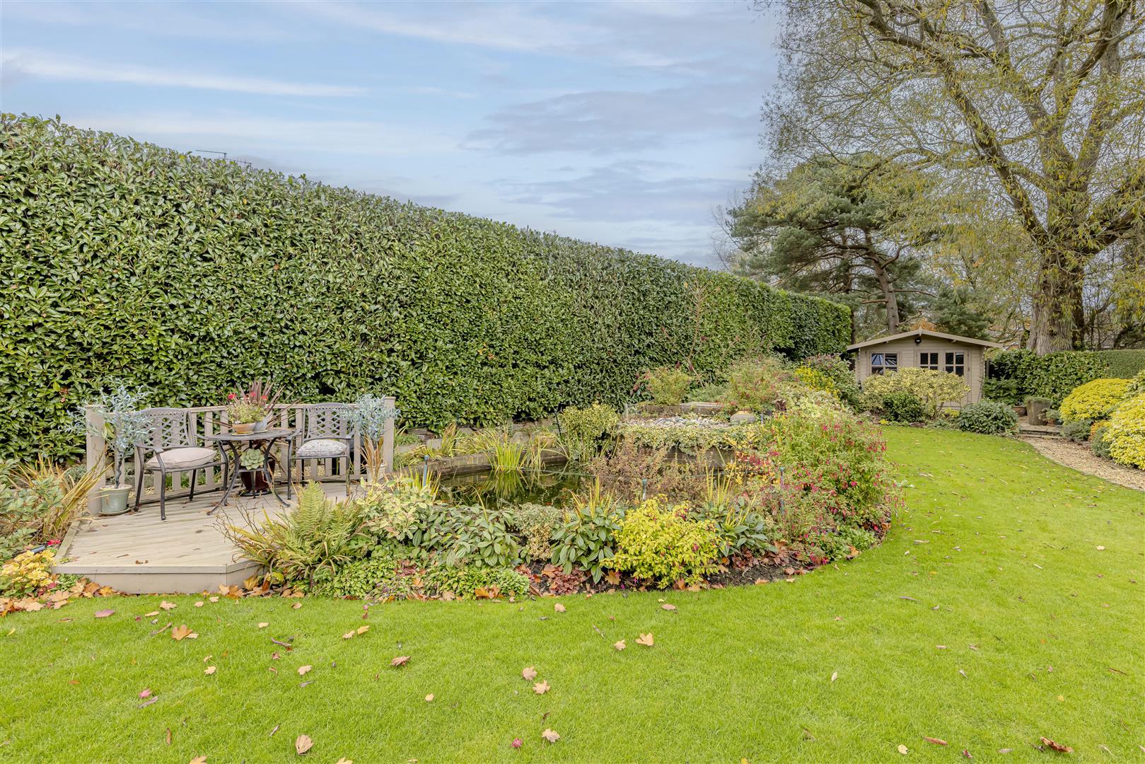 Access to the rear of the property reveals a generously sized landscaped garden featuring multiple seating areas. This enchanting outdoor space is adorned with mature trees, shrubs, and a lawn area, complemented by gravel pathways that meander throughout the garden. Highlights include a summer house and a pond, complete with a seating area for relaxation. A flagged patio area provides additional space for outdoor entertaining, seamlessly flowing into the side of the property.