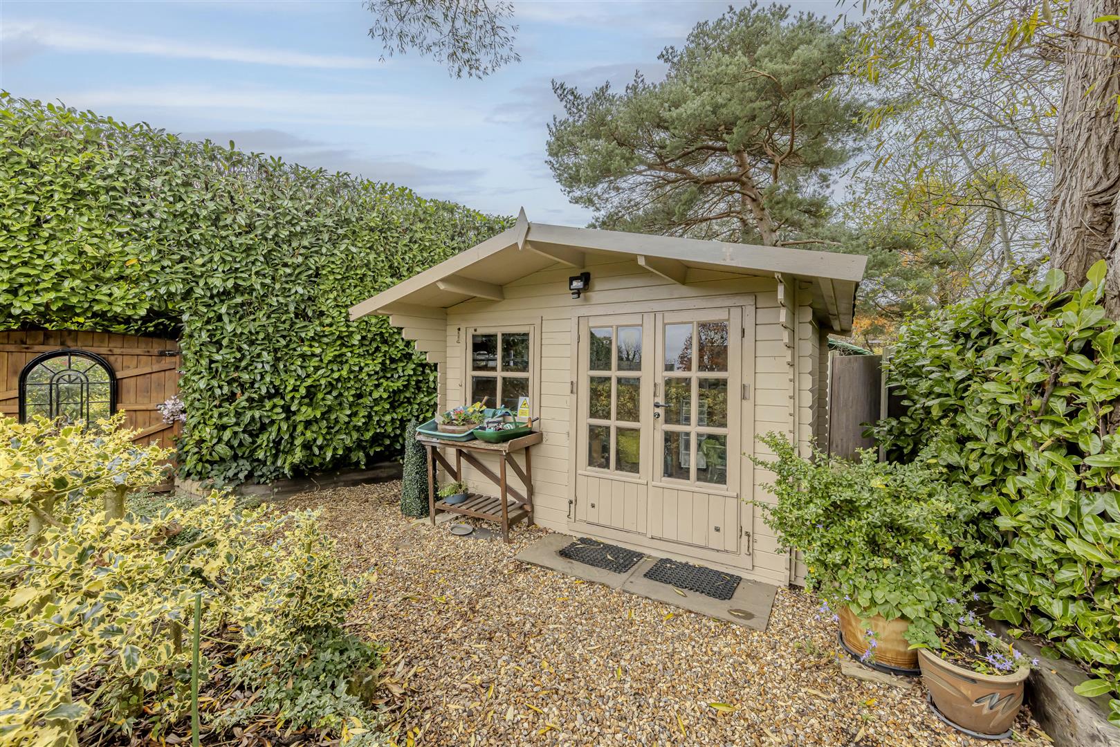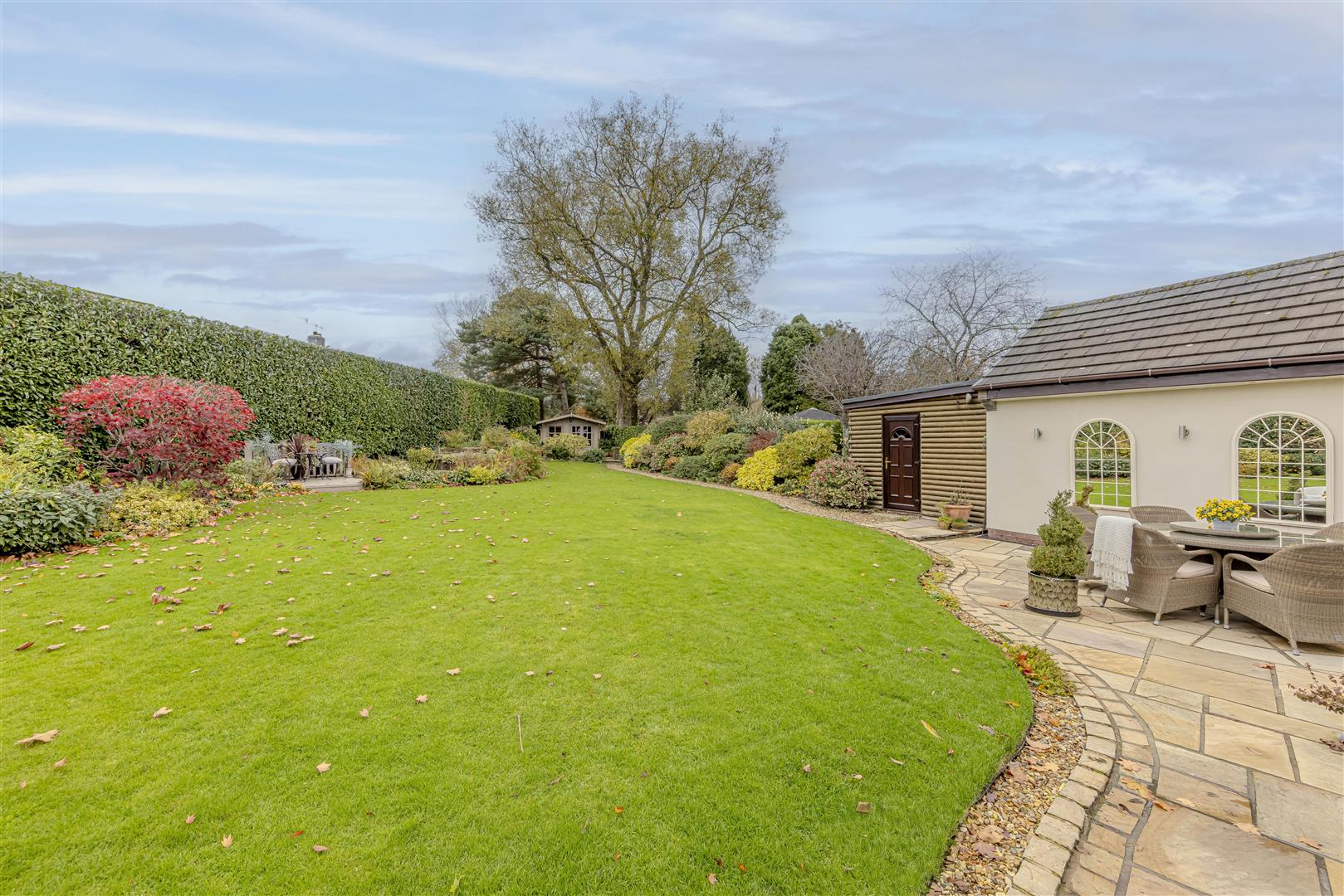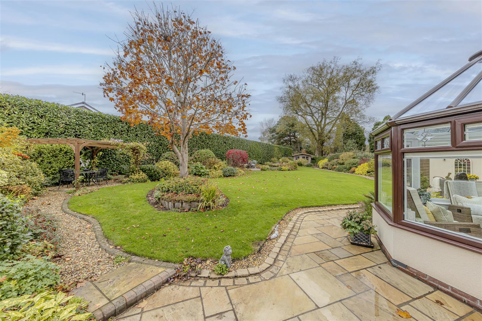 Access to the rear of the property reveals a generously sized landscaped garden featuring multiple seating areas. This enchanting outdoor space is adorned with mature trees, shrubs, and a lawn area, complemented by gravel pathways that meander throughout the garden. Highlights include a summer house and a pond, complete with a seating area for relaxation. A flagged patio area provides additional space for outdoor entertaining, seamlessly flowing into the side of the property.