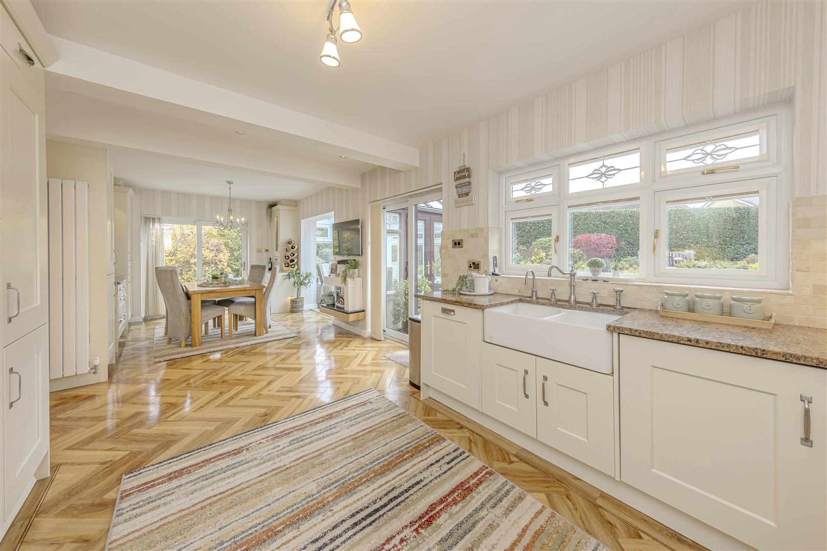 The kitchen dining area is impressively spacious, carefully divided into two distinct zones, featuring amtico flooring that extends throughout the space. It provides direct access to the conservatory/sun lounge and there are sliding patio doors made of durable PVC, lading out to the rear and to the side aspect of the gardens.