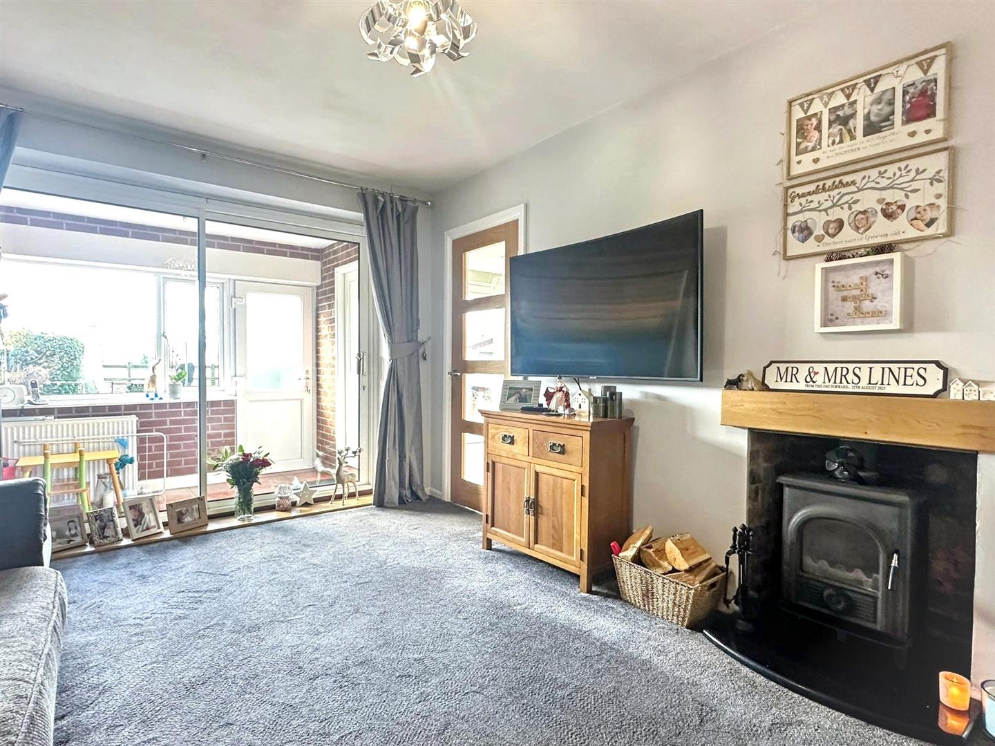Carpet. Log burner. Radiator. Sliding doors with access to rear porch. Ceiling light.