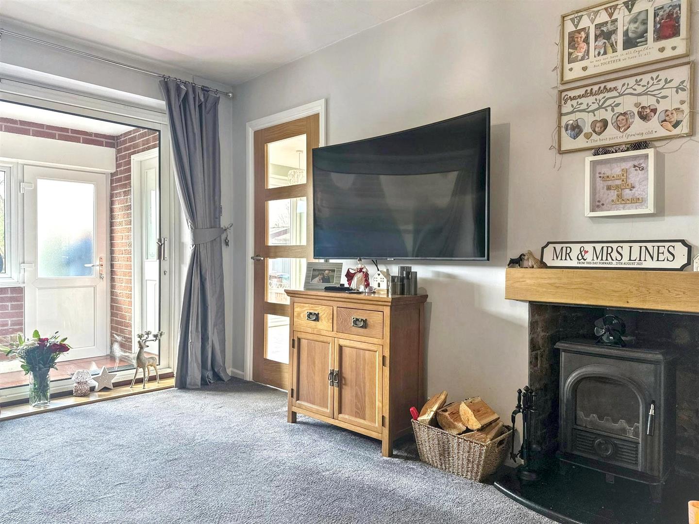To the rear of the property, there is a spacious lounge featuring a log burner, creating a cosy focal point. Sliding doors from the lounge lead through to a rear porch, allowing for additional seating or storage space while connecting nicely to the garden.