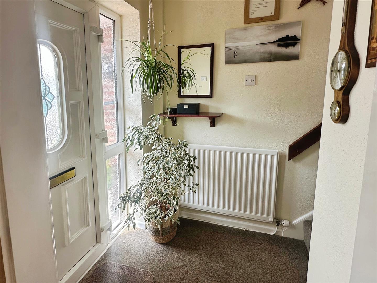 uPVC entrance door to the front aspect. Carpet. Radiator. Stairs leading to the first floor. Ceiling light. Door leading into: –