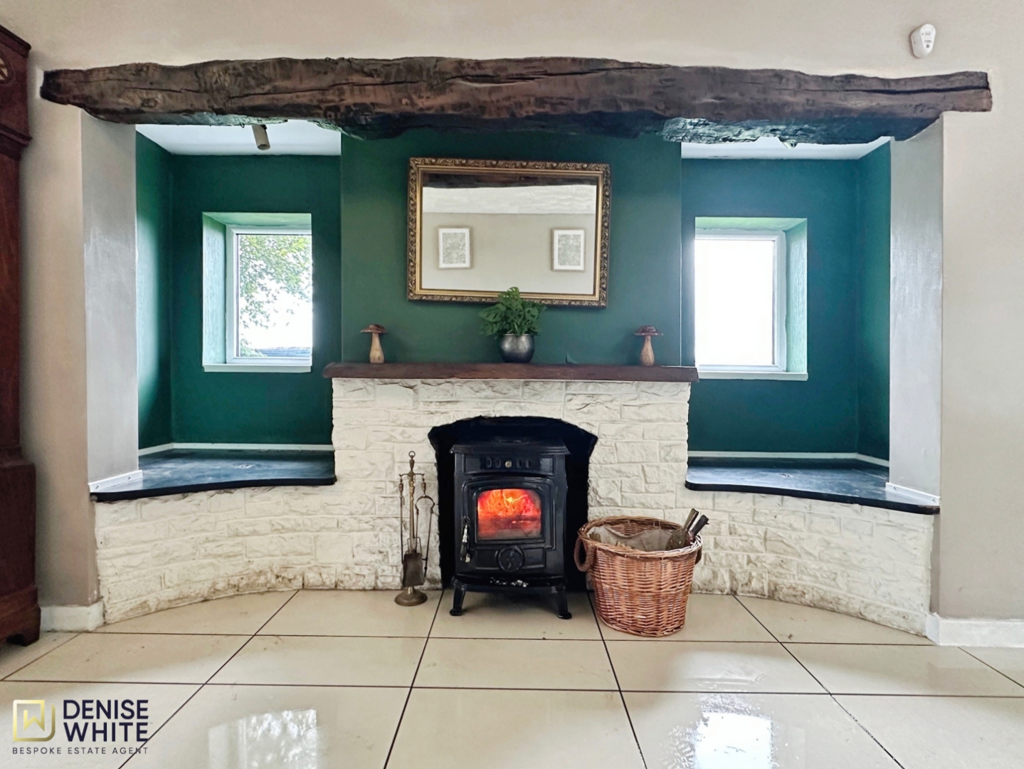 The property itself provides spacious, versatile accommodation, which is in need of some cosmetic improvement. An Entrance Hall welcomes you in, with stairs rising to the first floor and doors leading through to the ground floor accommodation. The Lounge, which spans one side of the property, is a generous and inviting space, featuring a multi-fuel stove and French doors that open onto the rear garden. A formal dining room sits alongside the spacious breakfast kitchen, complete with a central island and a feature fireplace housing a further multi-fuel stove. From here, you will find a walk-in pantry, a home office, and a useful utility room with access to both the garden and a versatile reception room. This additional space lends itself to a variety of uses and offers excellent potential for conversion into an annex, benefitting from its own private external access.