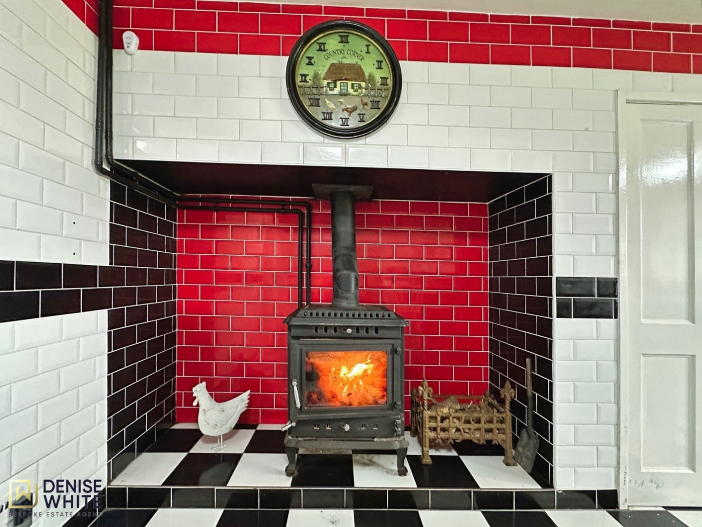 Fitted with a range of base units with work surfaces over incorporating a one and a half bowl ceramic sink and drainer unit with mixer tap. Centre Island housing a four ring induction hob with extractor over and double electric oven. Tiled flooring. Fully tiled walls. Fully tiled fireplace housing a cast-iron multi fuel stove. Radiator. uPVC window to the rear aspect. Two ceiling lights. Doors leading to the pantry, Office and Utility Room.