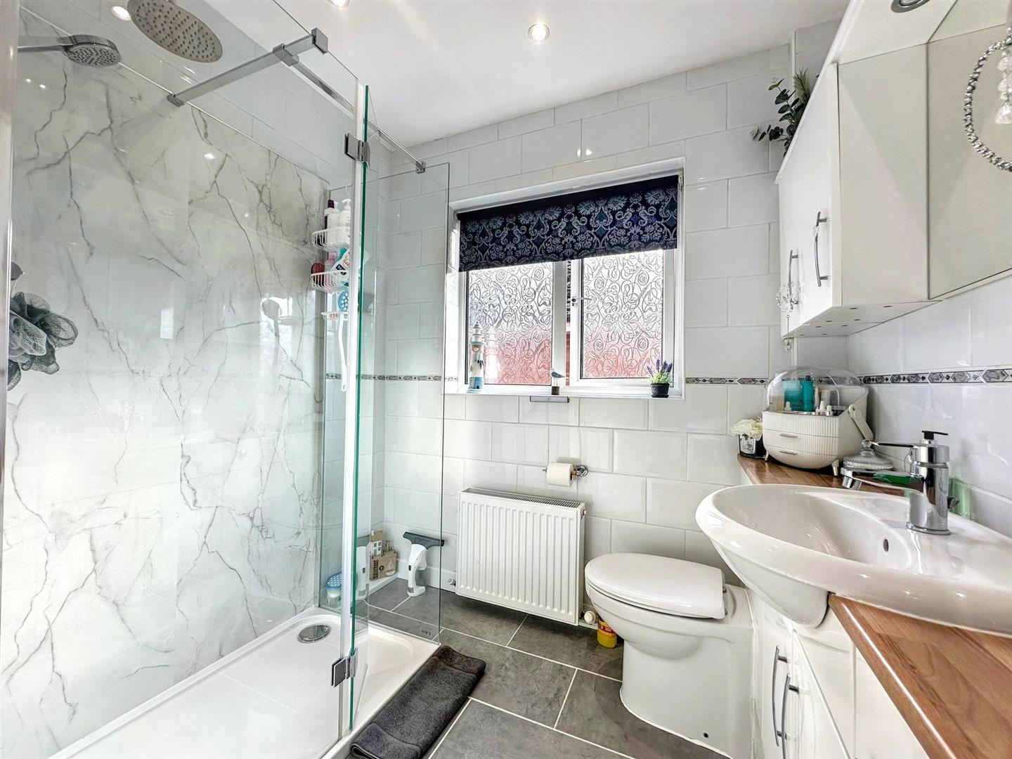 Fitted with a suite comprising of shower cubicle with rainfall shower and unit housing the wash hand basin and low level WC. Tiled flooring. Fully tiled walls. Radiator. Obscured uPVC window to the side aspect. Inset spotlights.