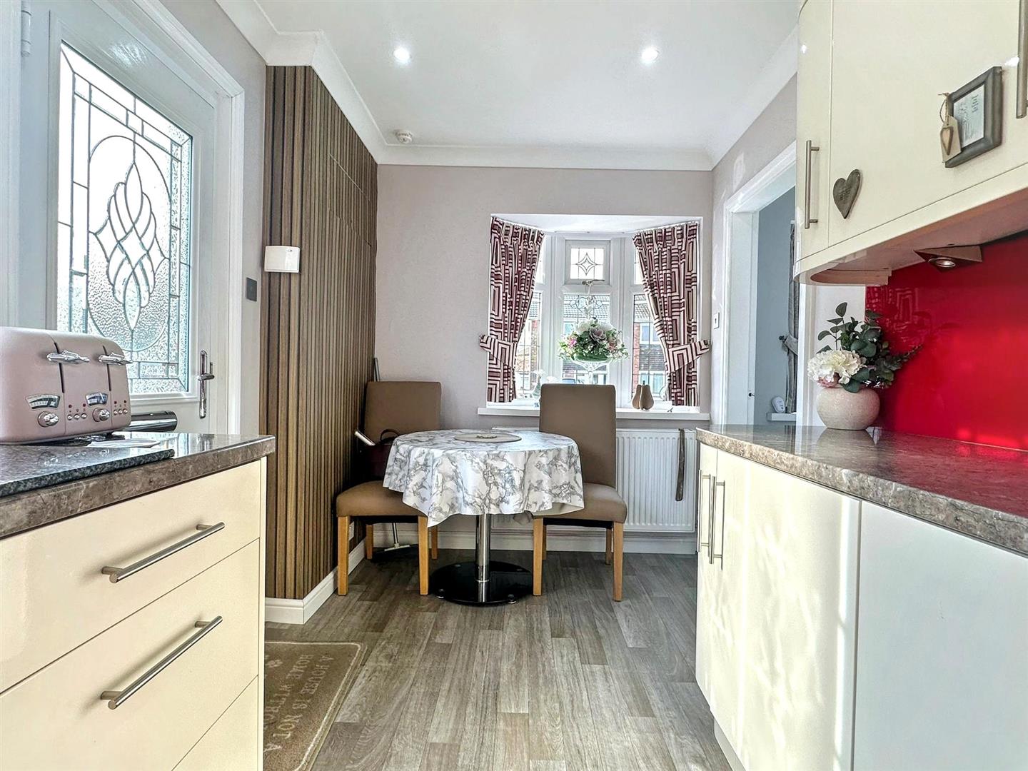 Fitted with a range of wall and base units with work surfaces over incorporating a double stainless steel sink and drainer unit with with mixer tap. Integrated four ring Gas hob with extract over, single electric oven and undercounter fridge. Composite door leading to the side aspect. uPVC bay window to the front aspect. uPVC window to the side aspect. Vinyl flooring. Radiator. Inset spotlights. Door leading into:-