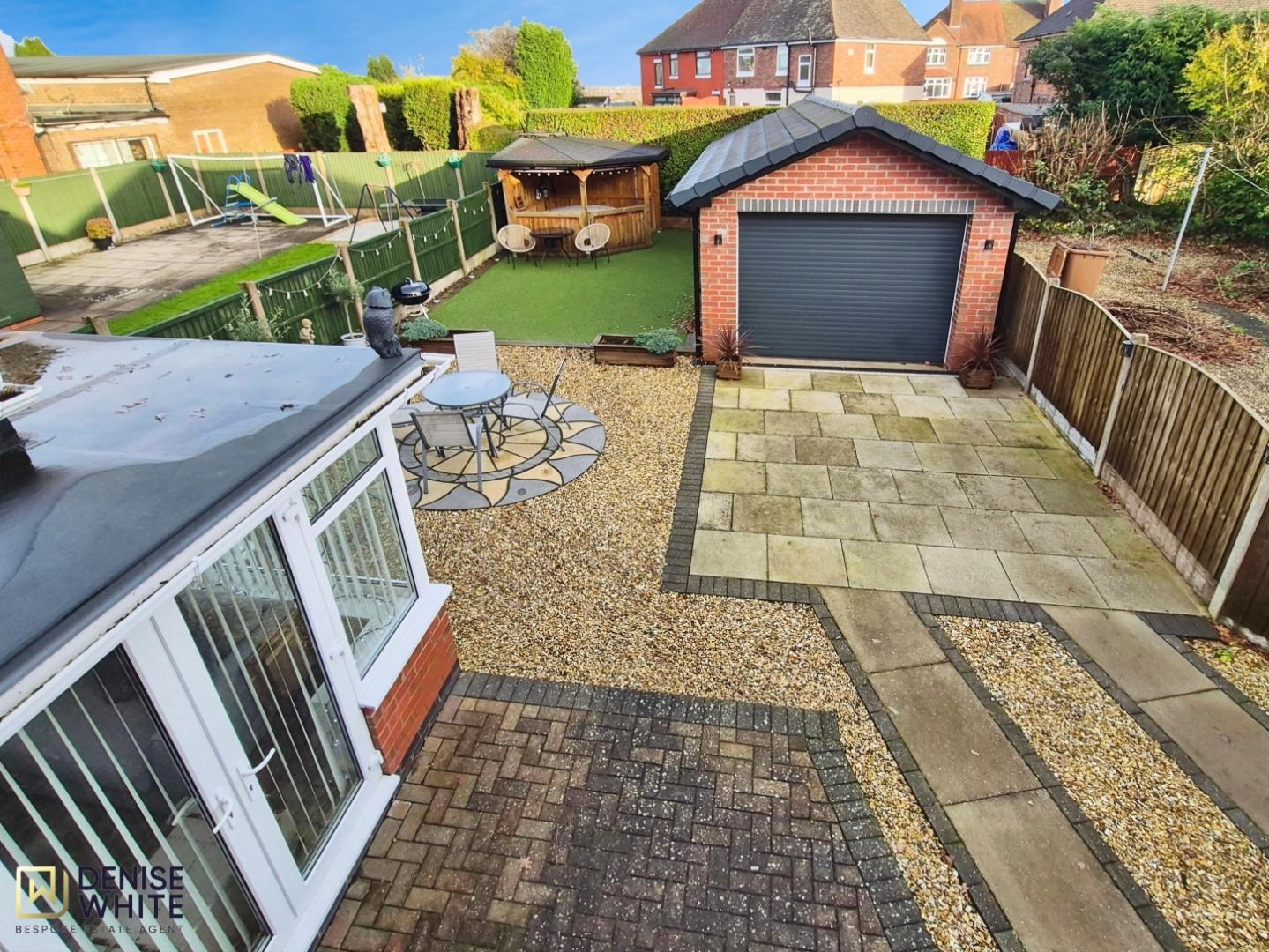 To the rear of the property there is a good sized, private and enclosed garden, with paved patio seating areas bordered with golden gravel, and overlooking an AstroTurf lawn. At the end of the garden there is a timber hot tub house with outdoor power points.