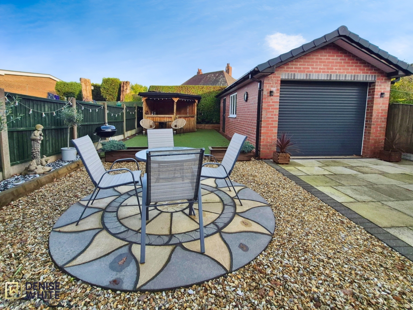 Externally, the property benefits from a gravelled driveway to the front providing off-road parking and leading through shared double gates to a detached double garage. The rear garden offers a superb low-maintenance space, ideal for alfresco dining and entertaining family and friends.