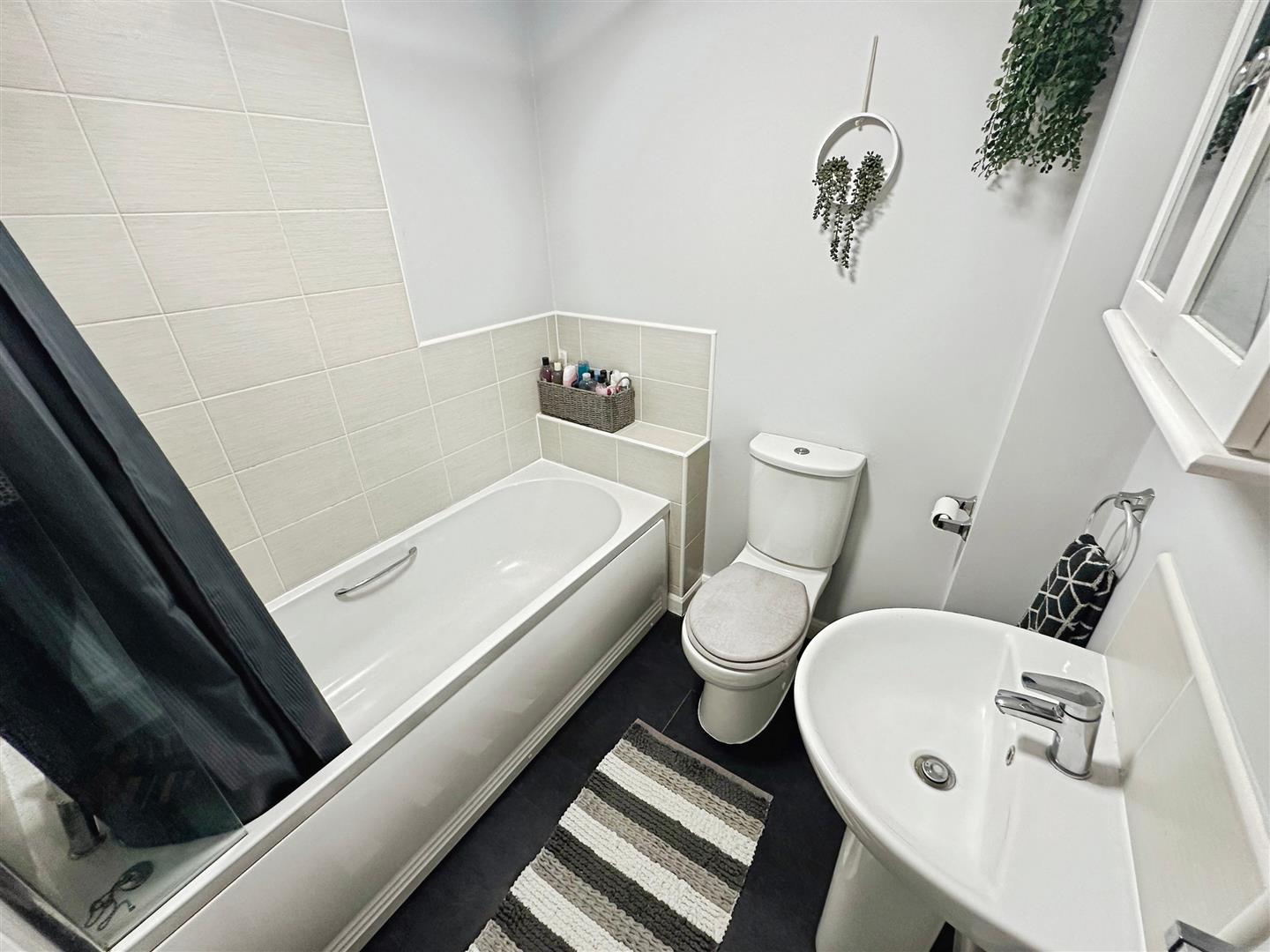 Fitted with a suite comprising of panelled bath with electric shower over, low-level WC and pedestal wash hand basin. Laminate tiled flooring. Radiator. Tiled walls. Ceiling light.