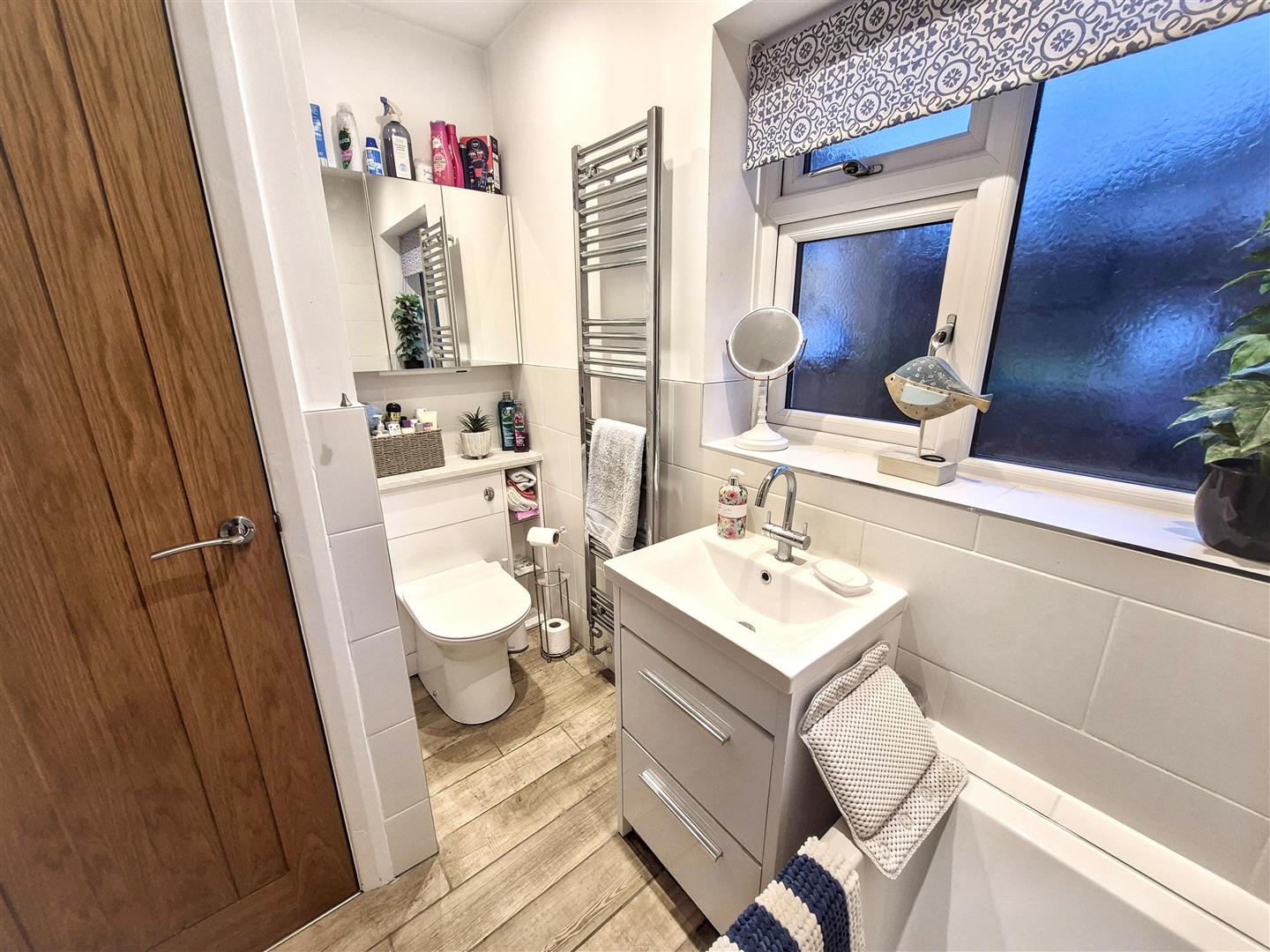 Fitted with a suite comprising of panelled bath with shower over, vanity wash hand basin unit and low level WC. Tiled flooring. Part tiled walls. Obscured uPVC window to the rear aspect. Wall mounted heated towel rail. Ceiling spotlights.