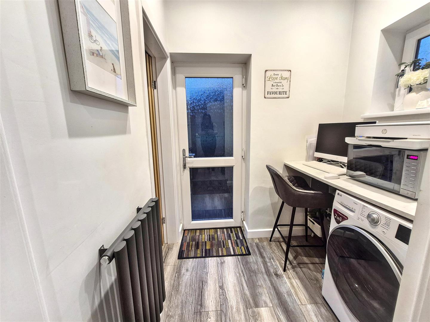 Plumbing for automatic washing machine with worksurface over. Laminate flooring. Radiator. Wall mounted glowworm gas combination boiler. Obscured uPVC window to the side aspect. uPVC door to the rear aspect. ceiling spotlights. Concertina door leading to a large cloak storage cupboard.
