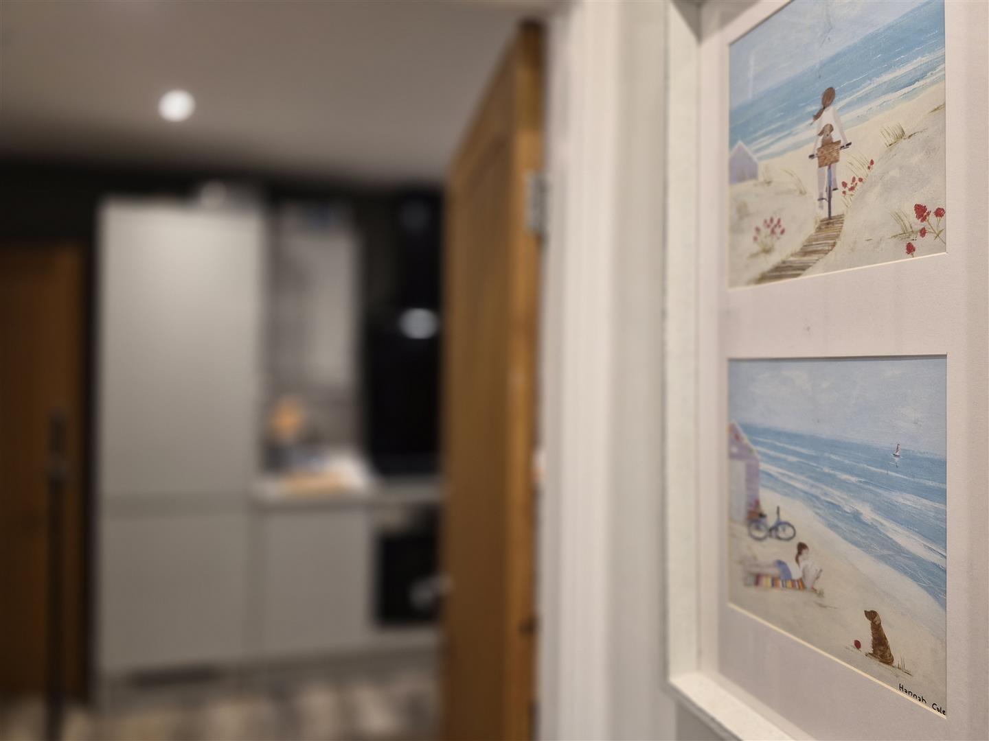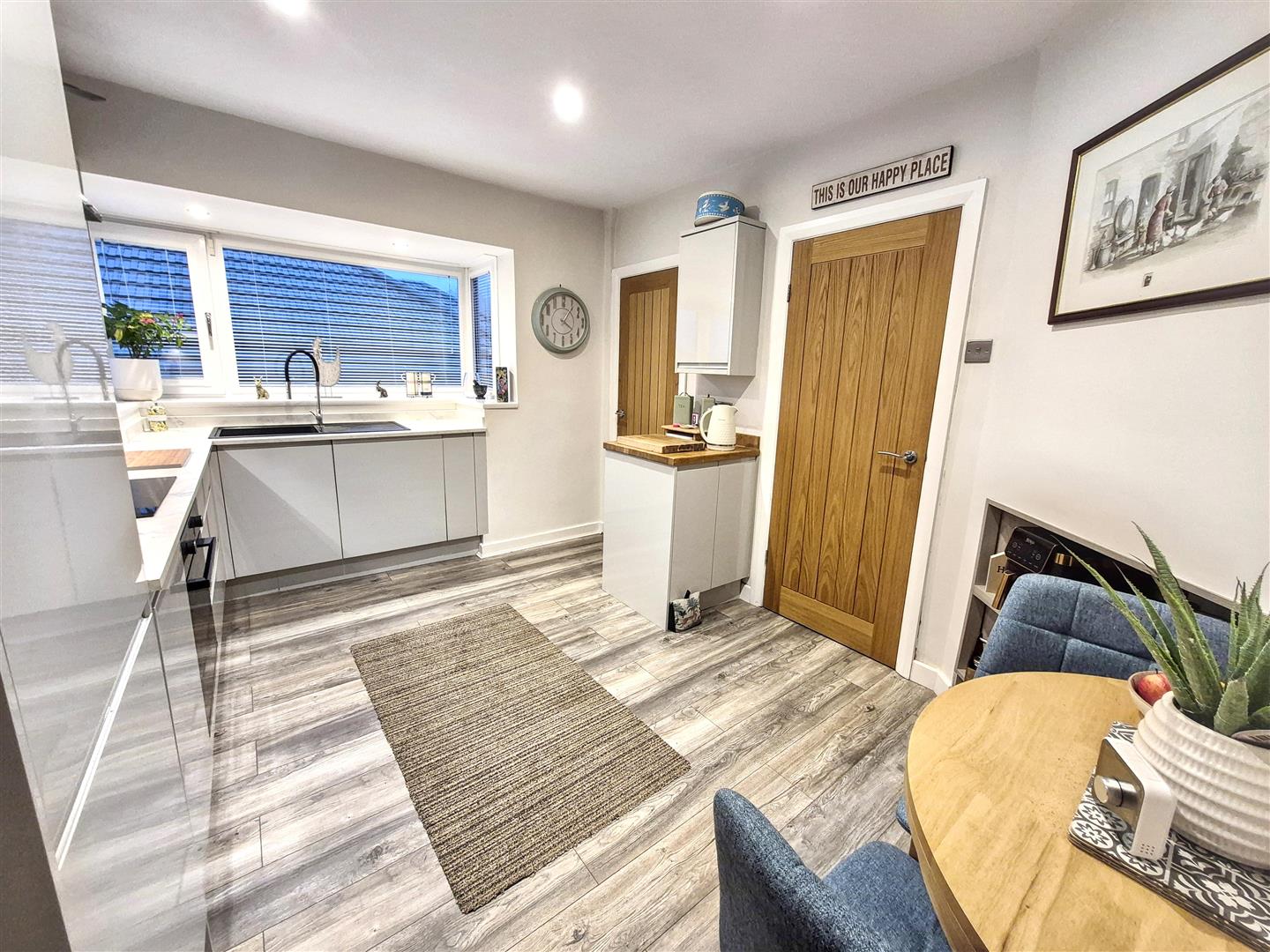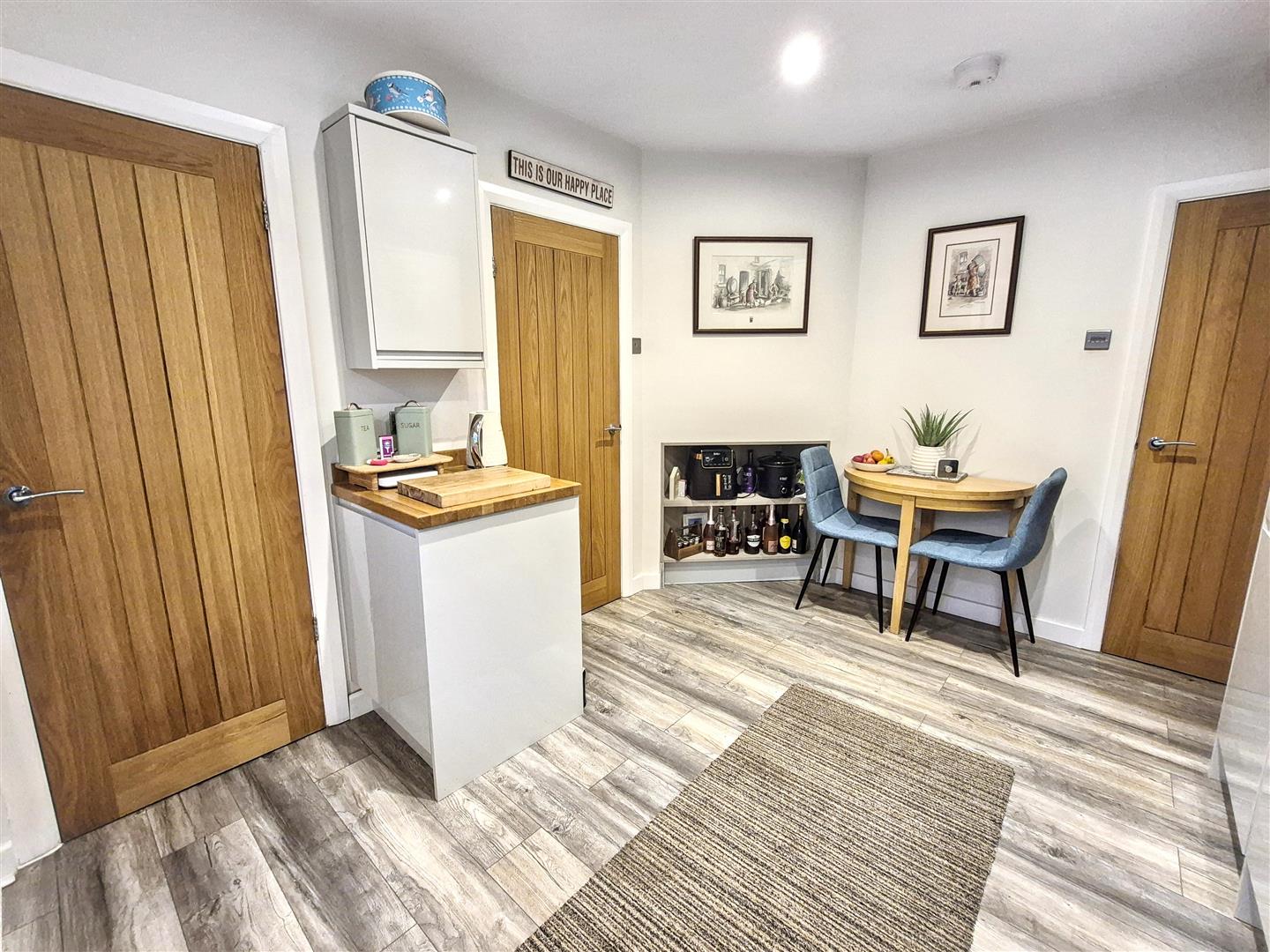 Fitted with a range of wall and base units with work surfaces over incorporating a sink and drainer unit with hose mixer tap. Integrated four ring ceramic hob with extract over, single electric oven, fridge freezer and dishwasher. Laminate flooring. Wall mounted upright radiator. Pantry cupboard off. uPVC box bay window to the side aspect. Ceiling spotlights. Door leading into: –