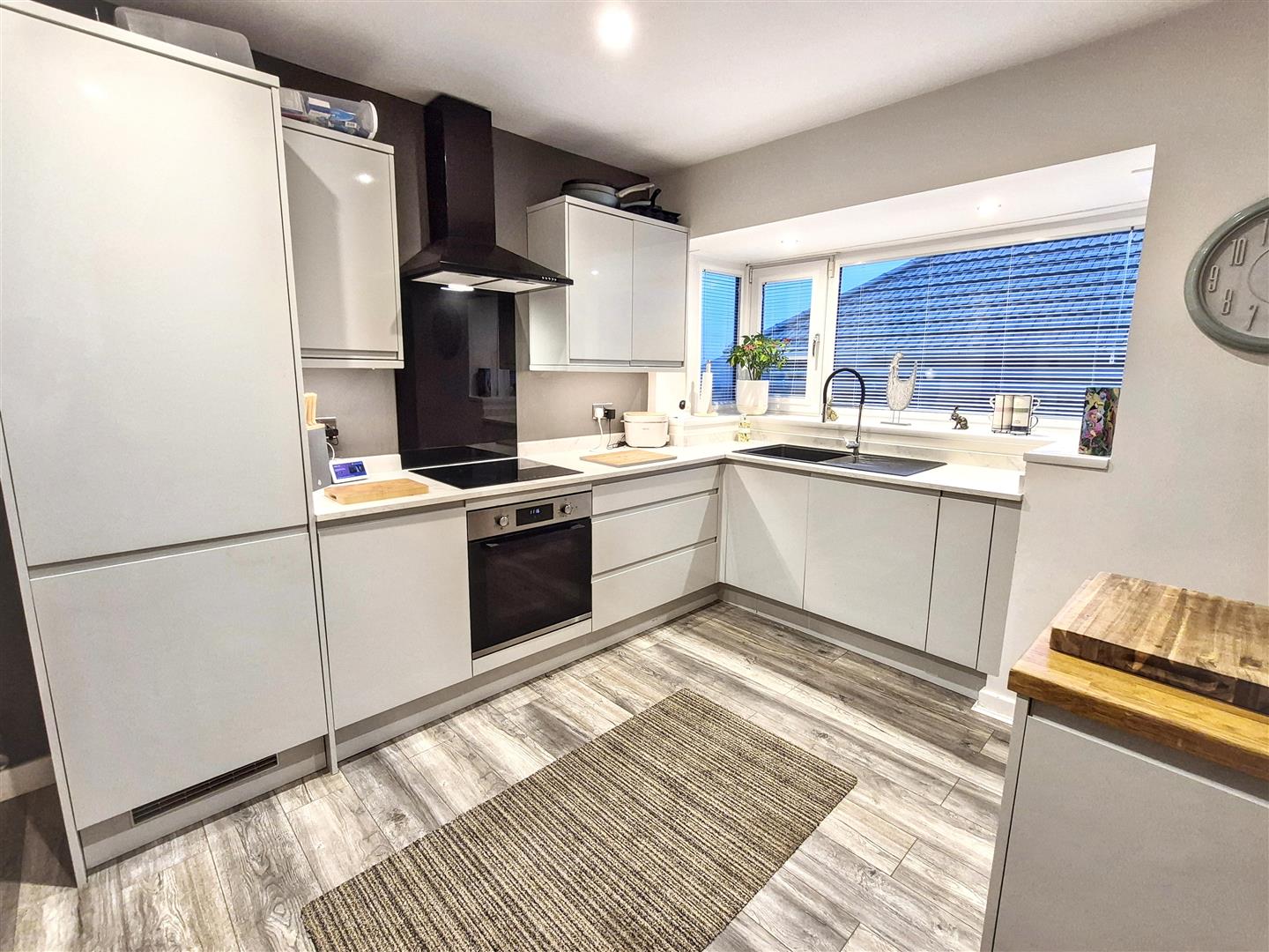 The kitchen is fitted with a modern range of units and provides space for a dining table and chairs, making it ideal for everyday living. A useful pantry cupboard offers excellent additional storage, while a door leads through to the utility room. Off the utility room is a large cloaks cupboard and a further door providing access to the rear garden.