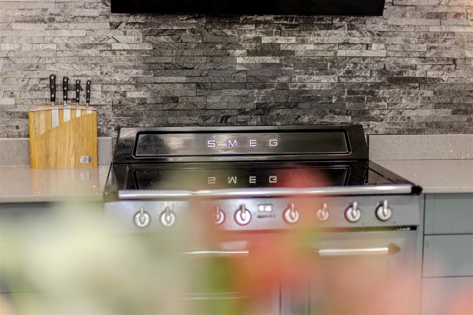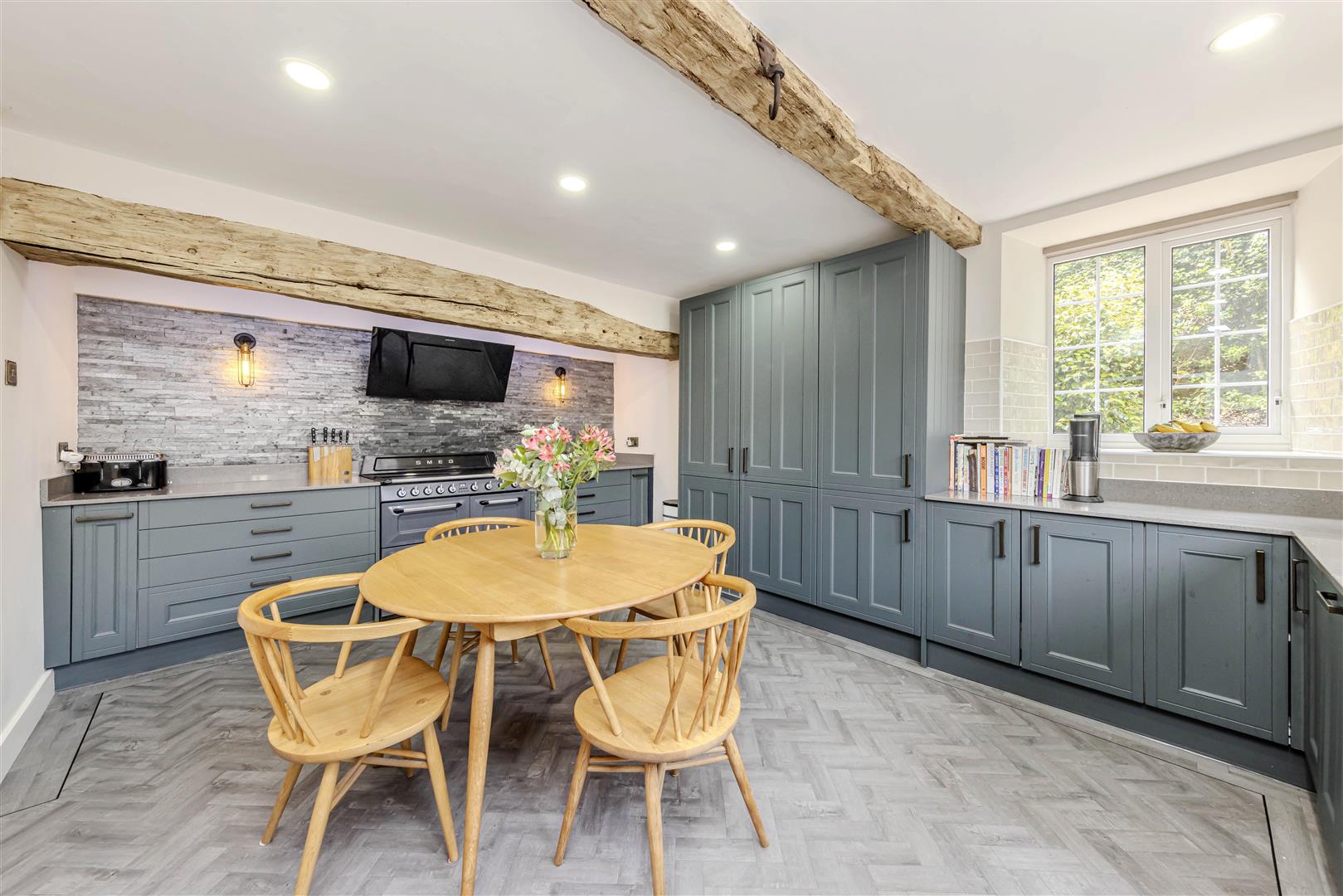 Upon entering the property through the entrance hall, you are greeted by a spacious breakfast kitchen that offers ample dining space. The kitchen boasts a stunning bespoke design, featuring an extensive range of floor and larder units finished with high-quality quartz worktops. This practical yet sociable layout is accentuated by the clean lines of bespoke cabinetry, beautifully framed by exposed beams and mullion windows, all complementing the overall aesthetic.