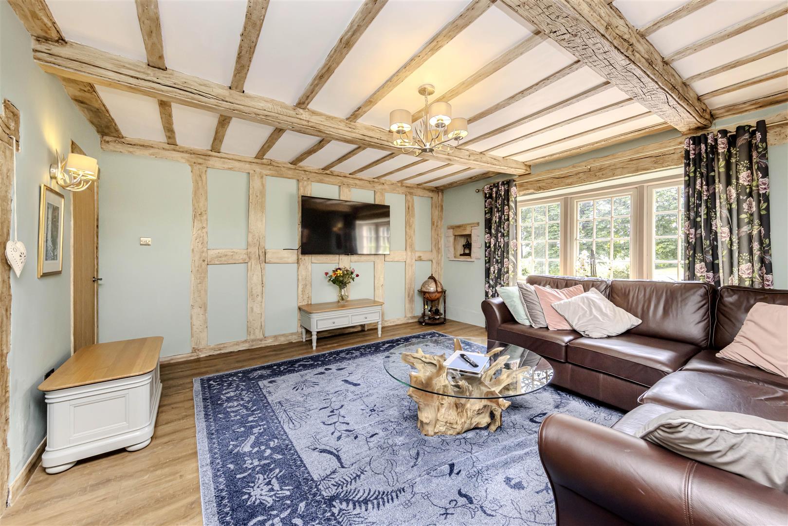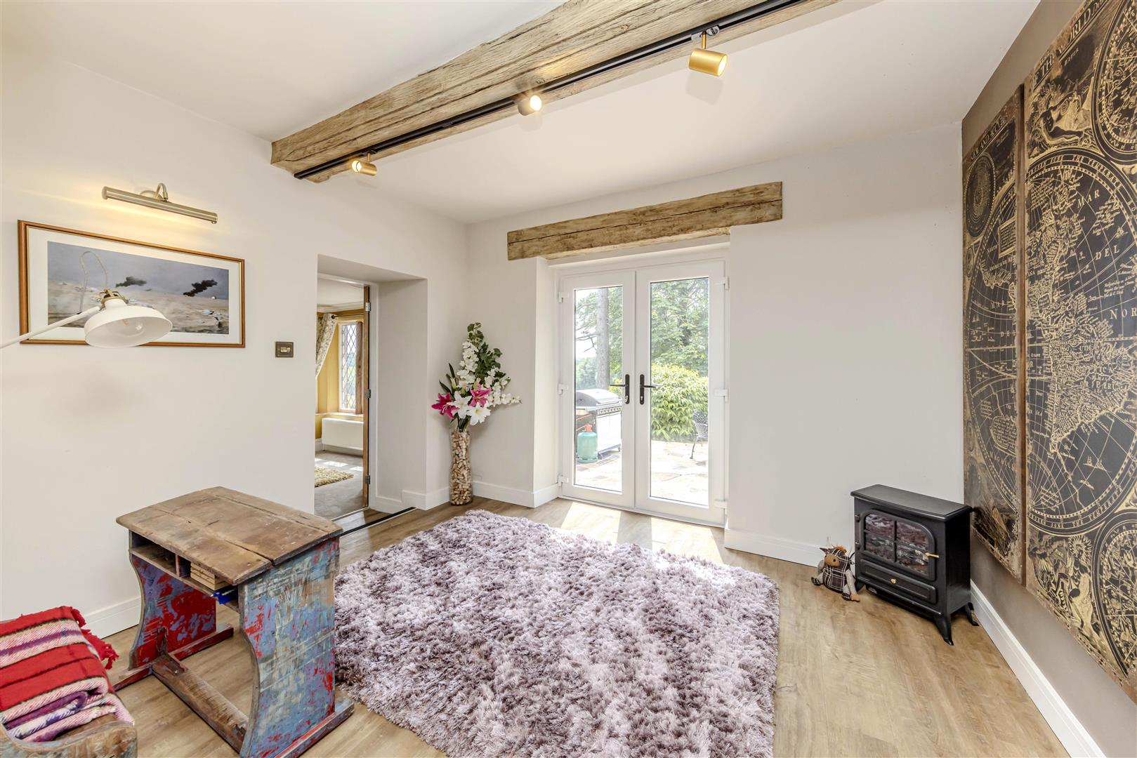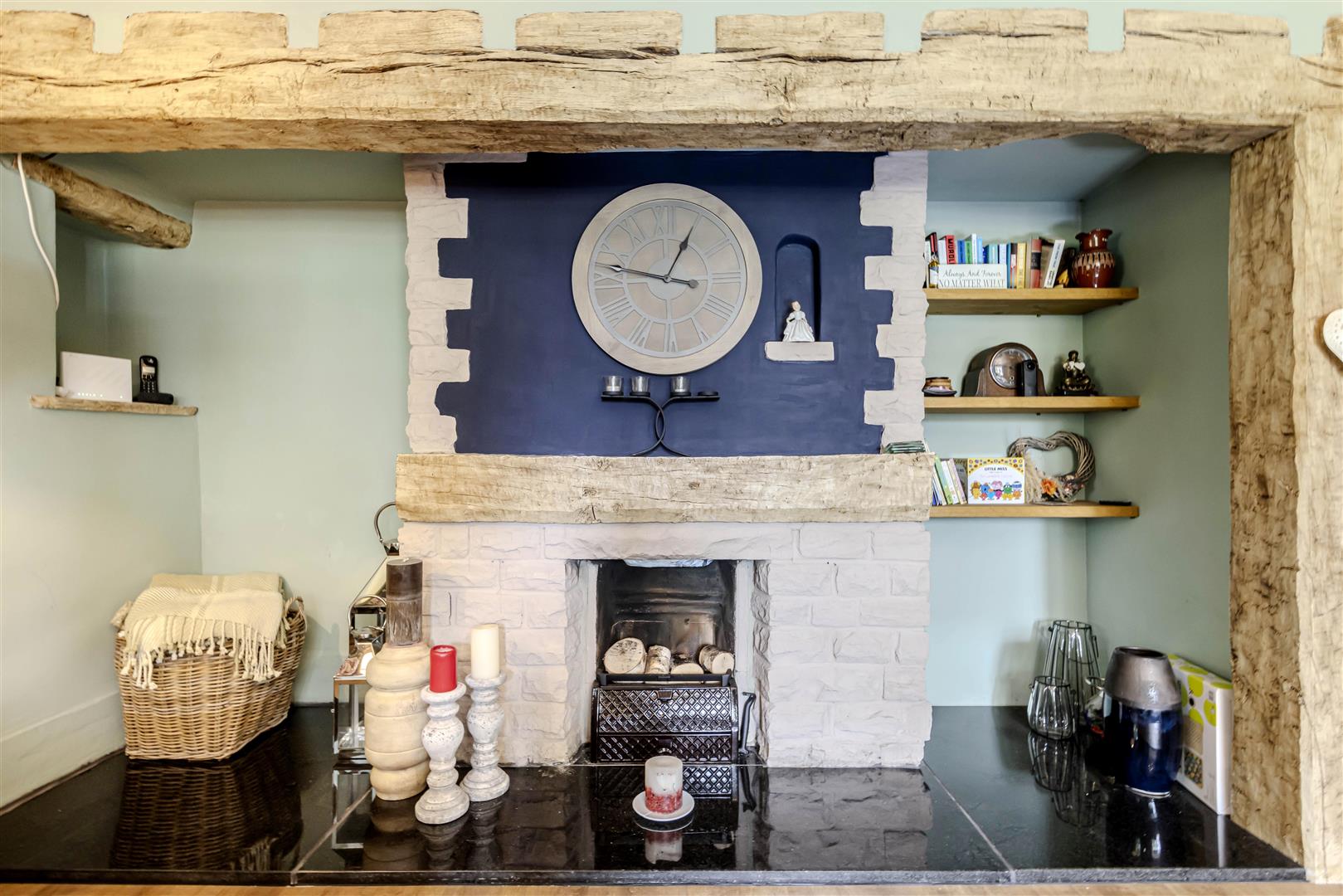 With open inglenook stone fire place, beam mantle, beam surround, shelving, raised hearth, exposed beamed ceiling, windows to the rear and side aspects with beams over, wall lights, exposed beamed walls, exposed wooden designed flooring, radiator.