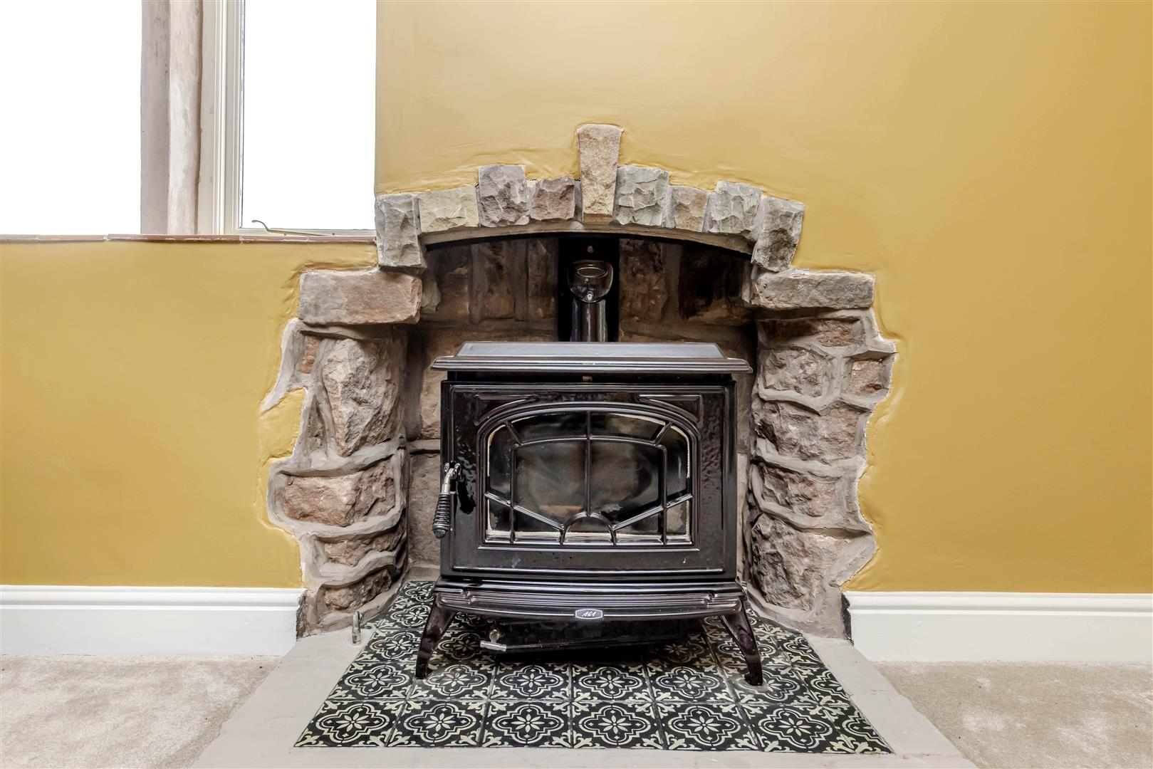 A feature multi fuel stove and stone surround with tiled hearth, leaded window over looking the rear gardens, windows to the side aspect, radiator, feature arched alcove with additional radiator, ceiling light, fitted carpet, coving to the ceiling.