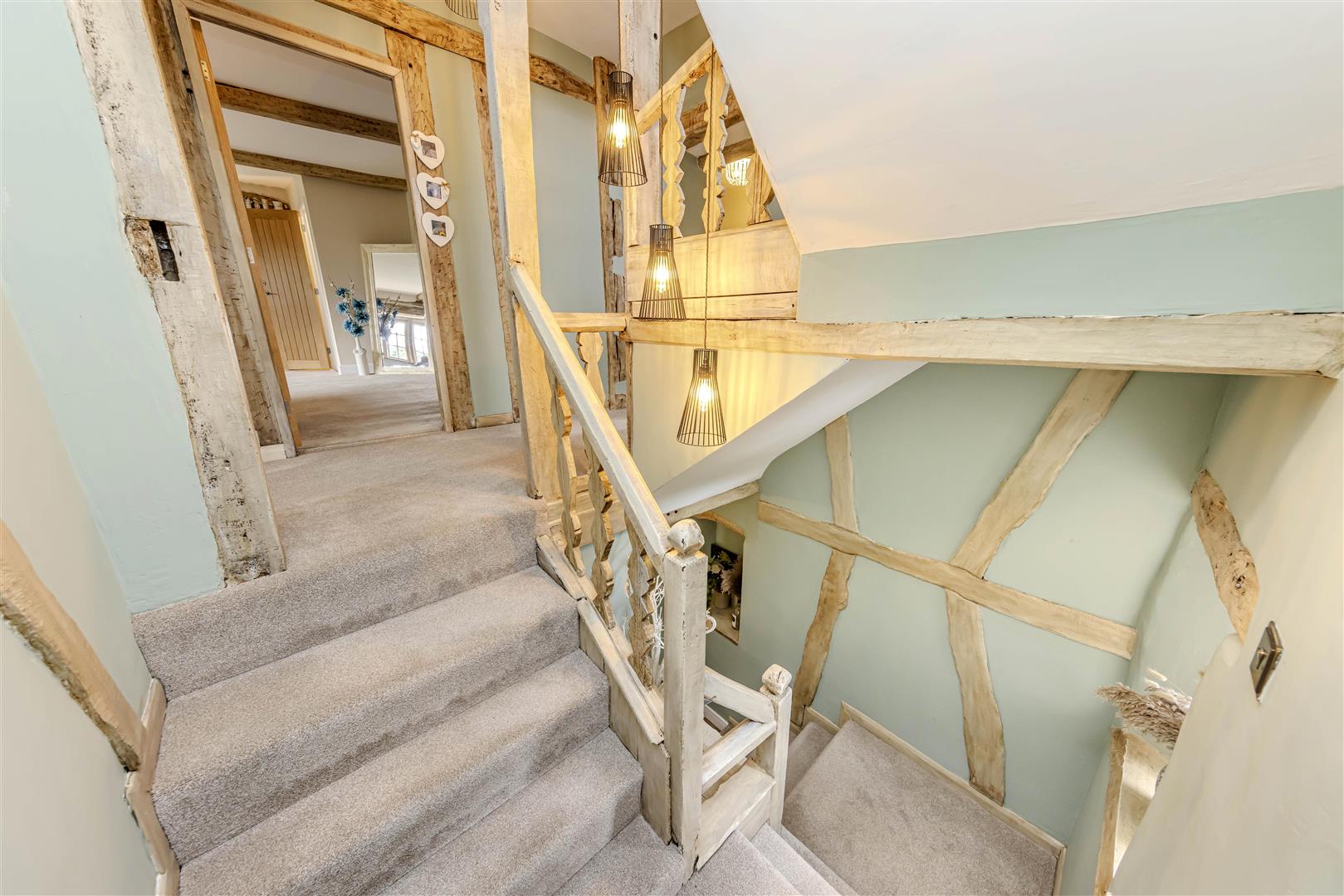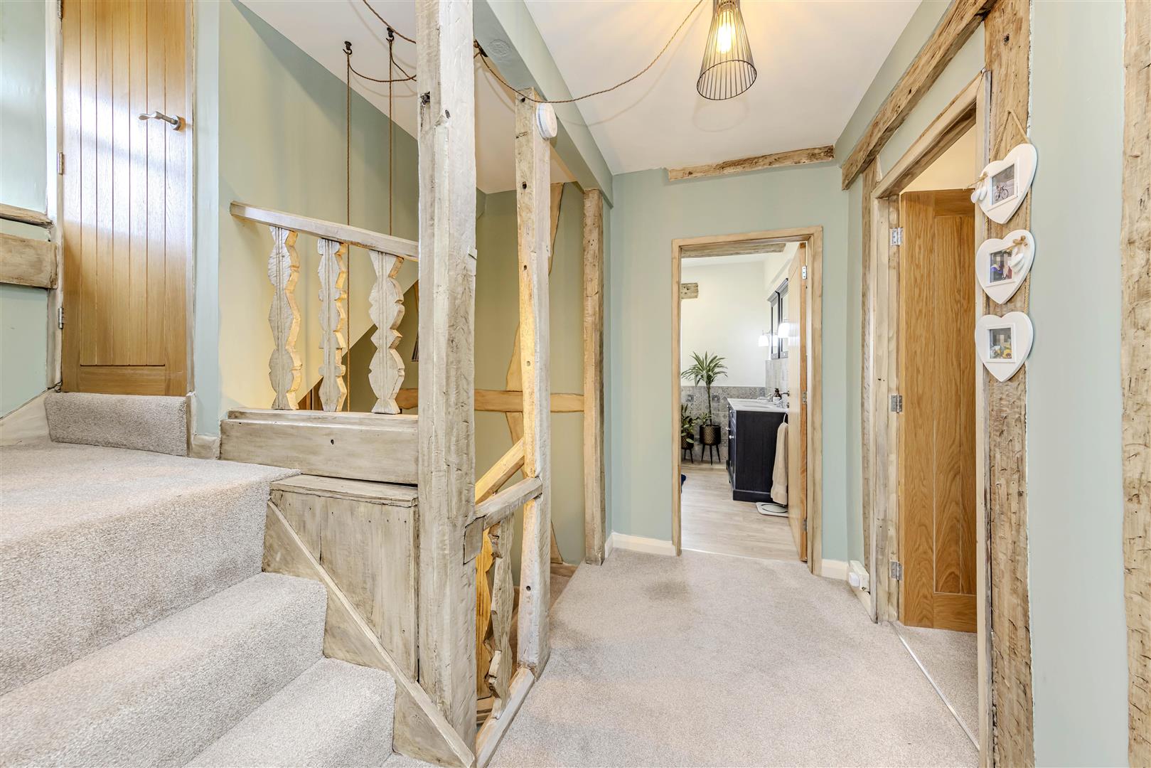 Oak original staircase with exposed beams leading to First Floor Landing with airing cupboard and giving access to:-