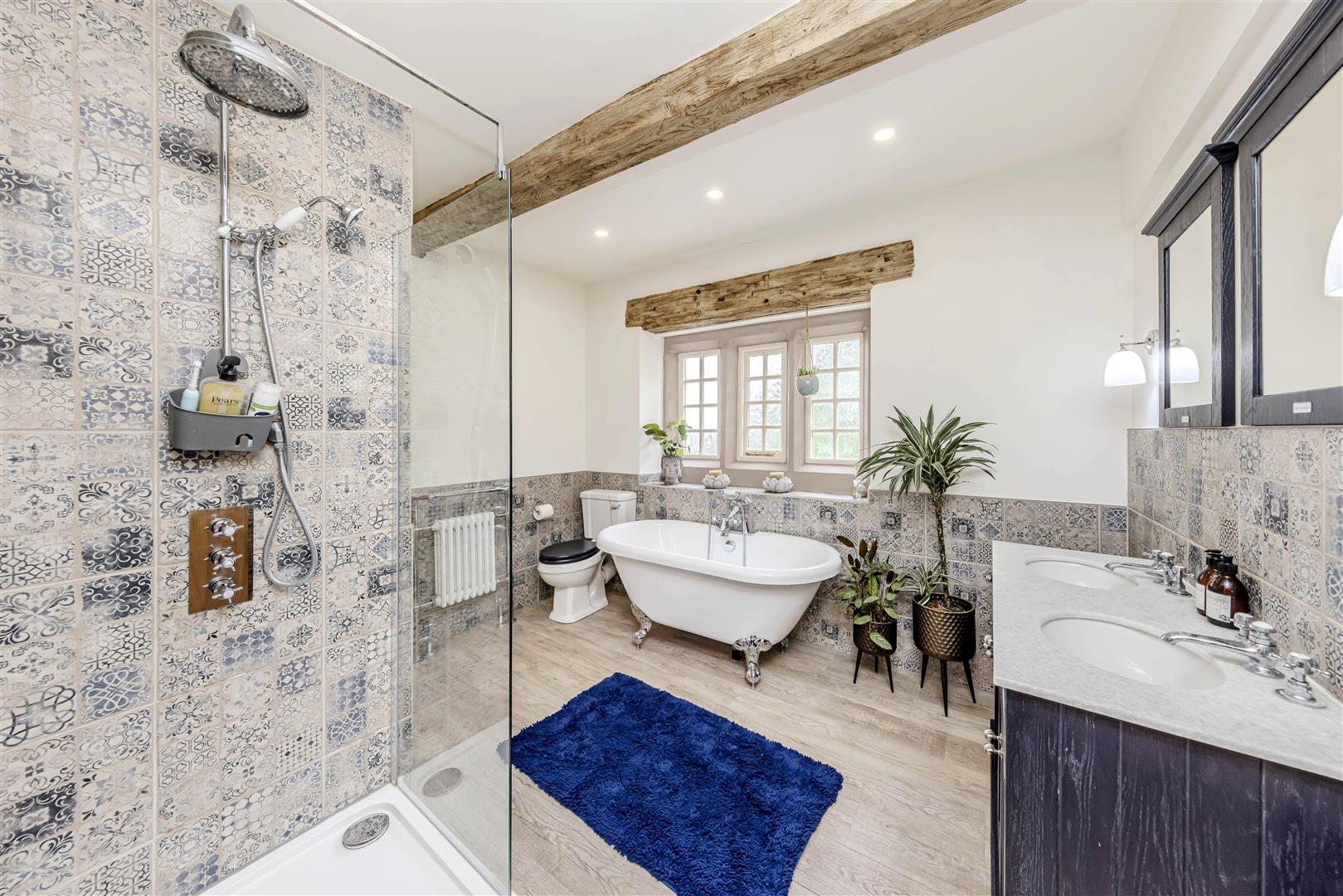A luxury fitted bathroom with roll top freestanding bath, clawed feet, central tap and shower attachment, his and her vanity sink units with storage under and two fitted wall mirrors over, wall lights, walk in shower cubicle with shower head and attachment, wooden exposed designed flooring, W.C. part tiled walls, windows to the rear with exposed beam over, exposed beamed ceiling, storage cupboard, heritage style radiator with towel rail.