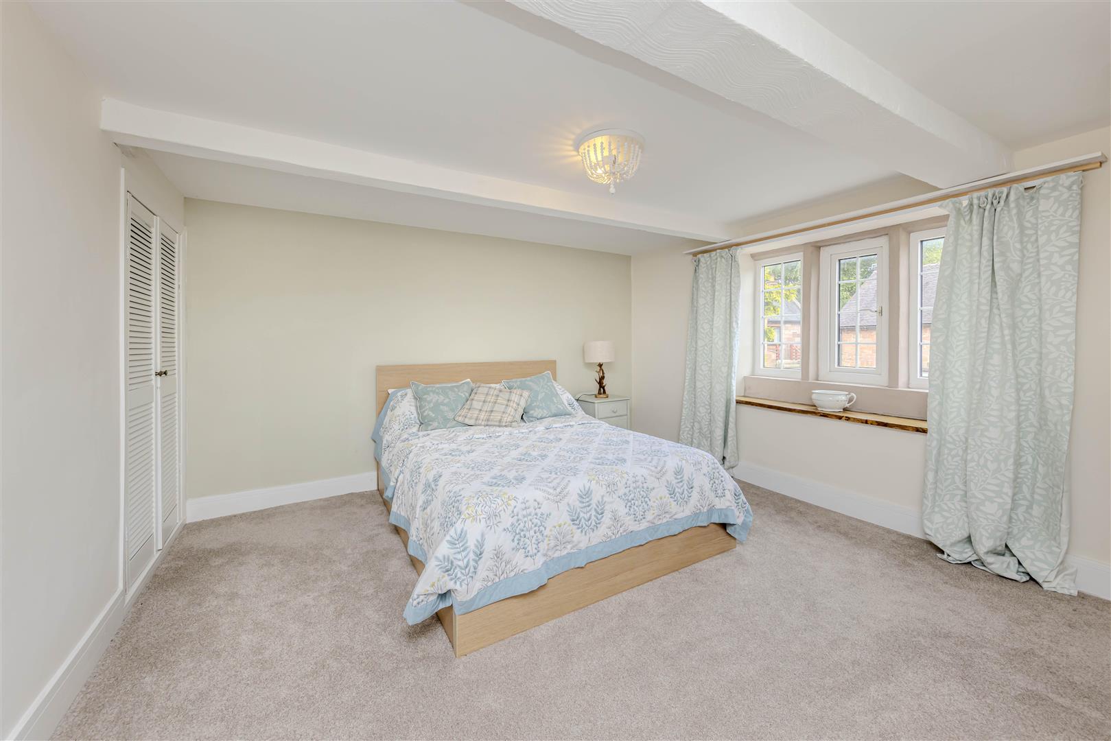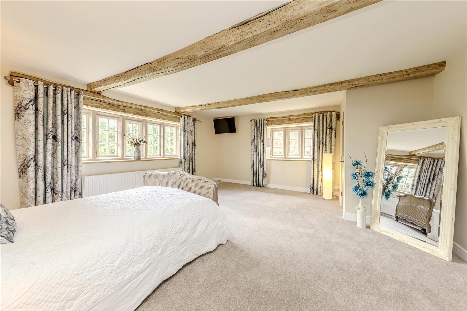 Large main bedroom providing adequate space for seating area, making a lovely suite, windows to the rear and side aspects with beams over, feature wall with exposed beams and wall lights, fitted