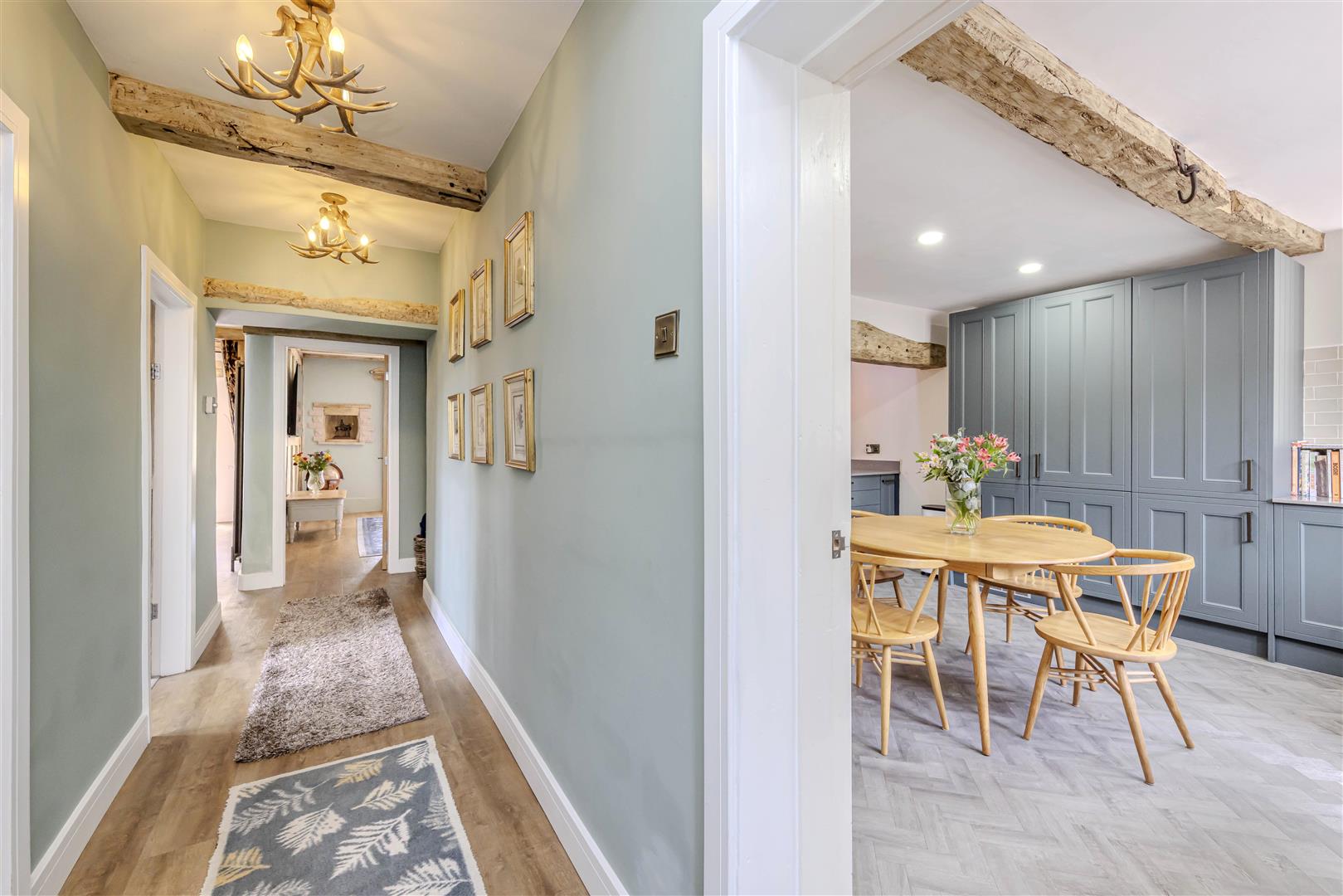 Wooden designed exposed flooring, exposed beams to ceiling, ceiling lights, access to the ground floor accommodation, access to the cellar and staircase leading to the first floor.