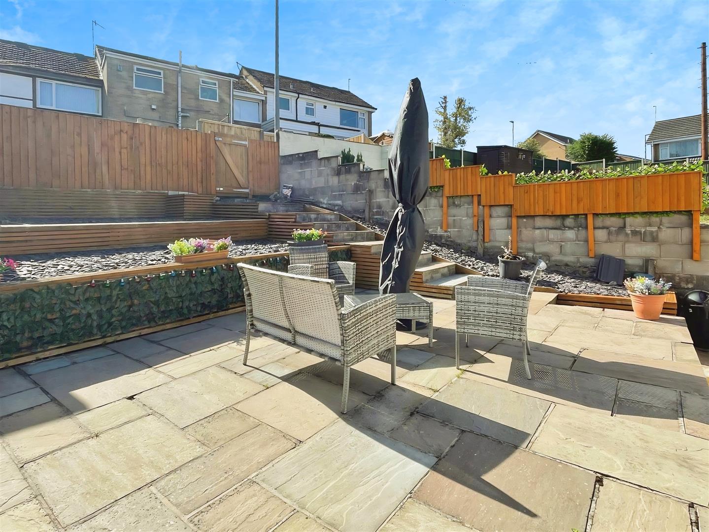 Externally, the property is just as impressive. To the front, a stone-paved driveway provides off-road parking. The tiered rear garden is thoughtfully landscaped, beginning with a stone patio directly accessed from the lounge—perfect for entertaining. Steps lead to two further levels featuring slate chipping borders, offering low-maintenance outdoor enjoyment.