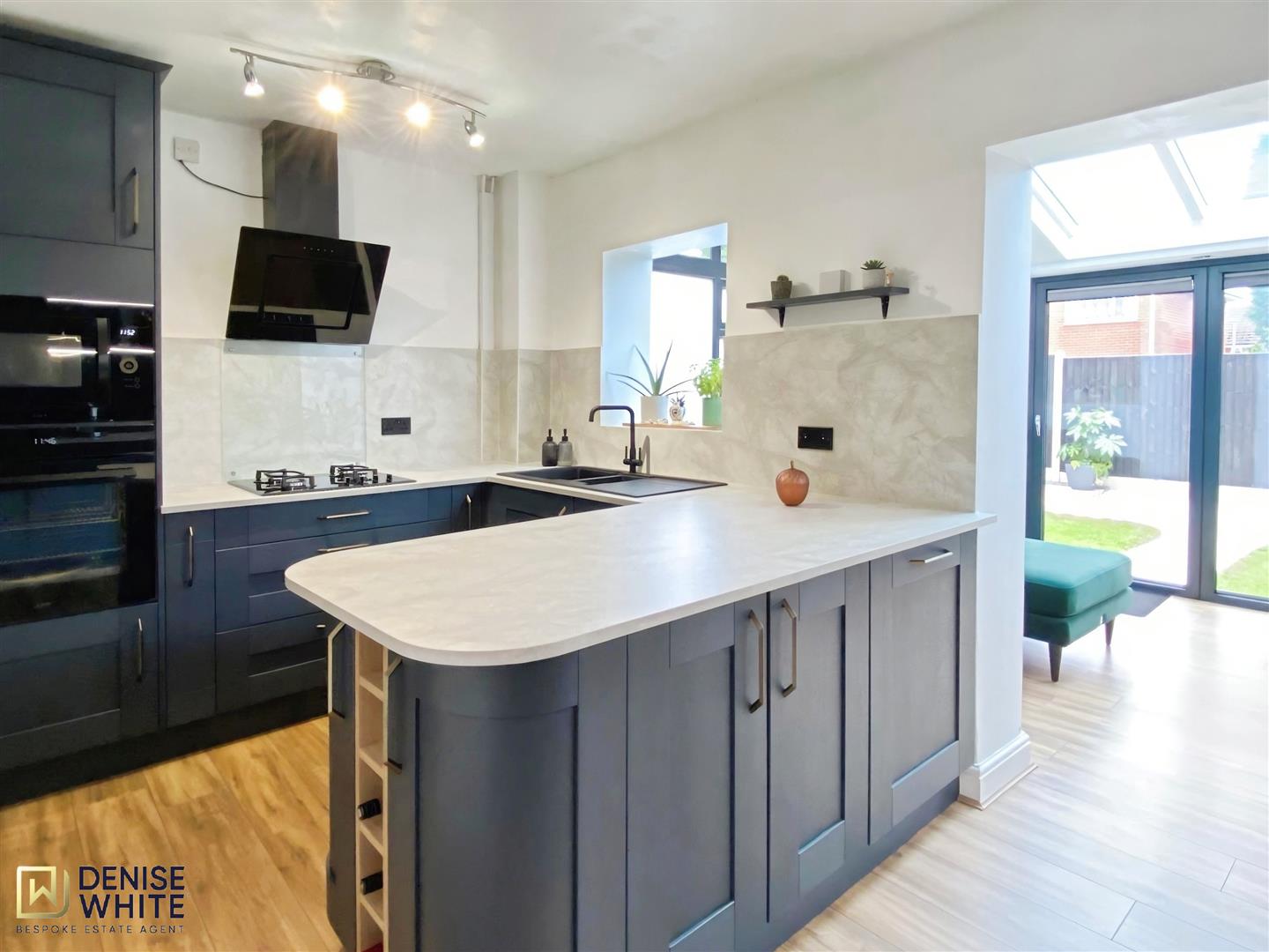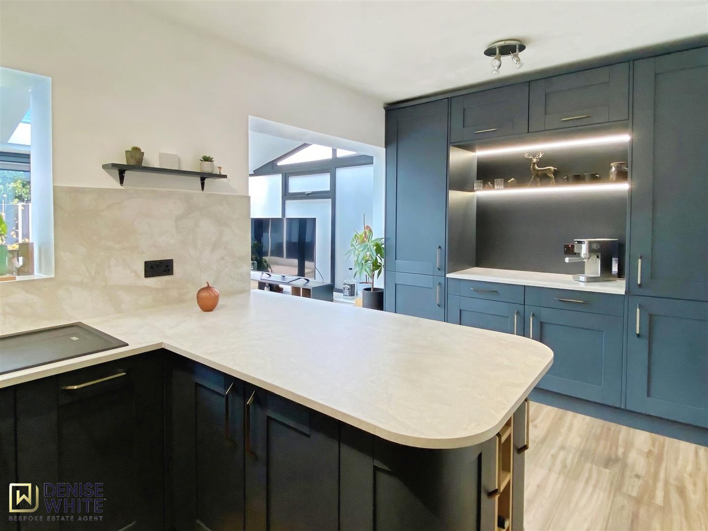 Internally, the property features a welcoming living room enhanced by bespoke panelling, creating a warm and elegant first impression. This opens seamlessly into a striking open-plan breakfast kitchen, fitted with navy shaker-style cabinets, a breakfast bar, and a dedicated coffee station—forming the social heart of the home.