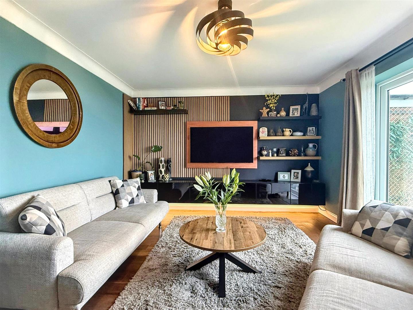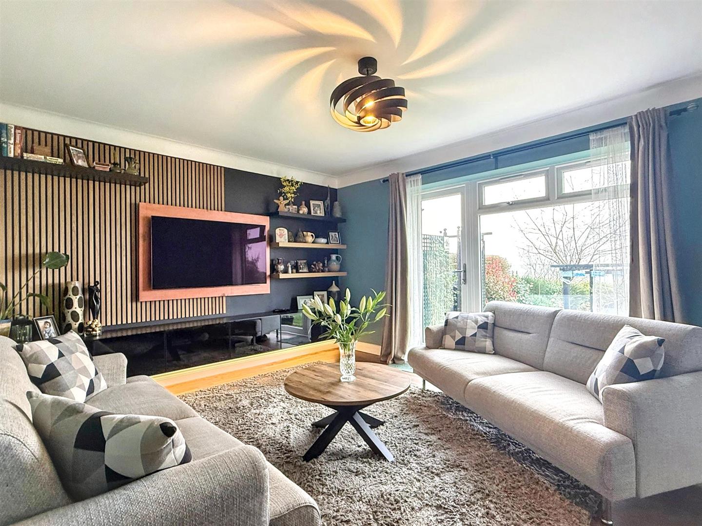 The lounge is located to the rear of the property and is a particularly impressive space, featuring a contemporary part-panelled media wall and a door that open out to the rear garden, allowing natural light to flood the room while framing the beautiful outlook beyond.