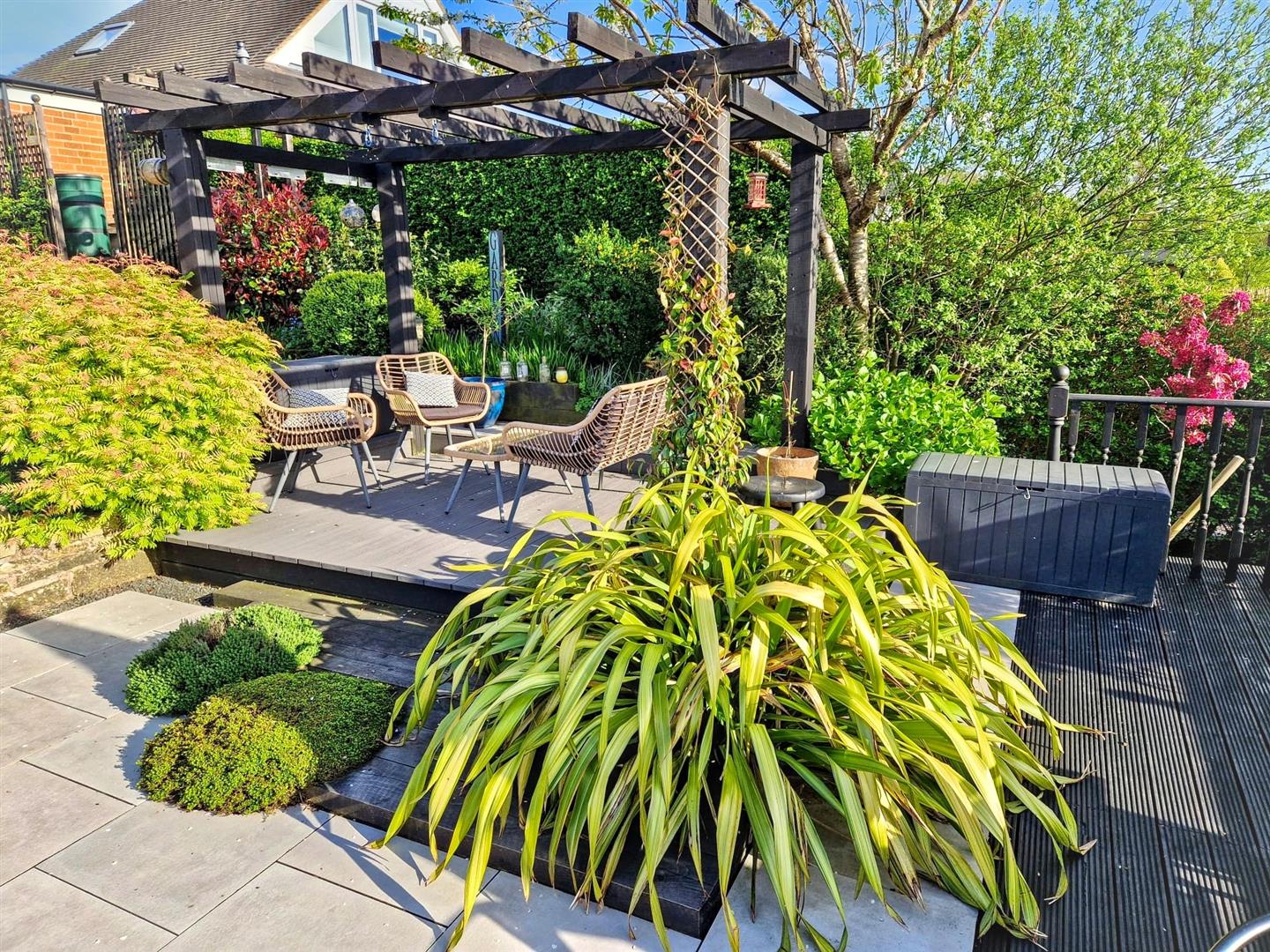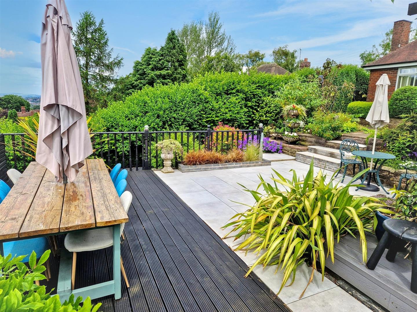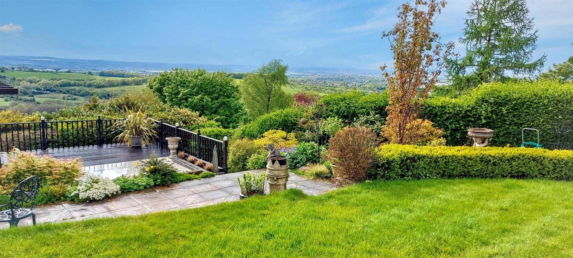 The rear garden is a true highlight of the property and has been thoughtfully landscaped to create a beautiful and relaxing outdoor space. A well-maintained, manicured lawn is bordered by a variety of mature shrubs and planting, providing both colour and privacy throughout the seasons. A paved pathway gently winds through the garden, leading to attractive paved and decked seating areas which provide the perfect places for outdoor dining, entertaining, or simply enjoying the peaceful surroundings. From these elevated seating areas, the garden enjoys stunning far-reaching views over the surrounding cityscape and beyond, making it a particularly special place to sit and unwind.