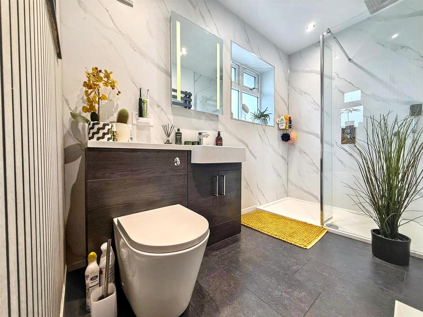 Fitted with a quite comprising of low level WC, vanity wash hand basin unit and walk in shower with rainfall showerhead. Tiled flooring with underfloor heating. Heated towel rail. Obscured uPVC windows. Inset spotlights.