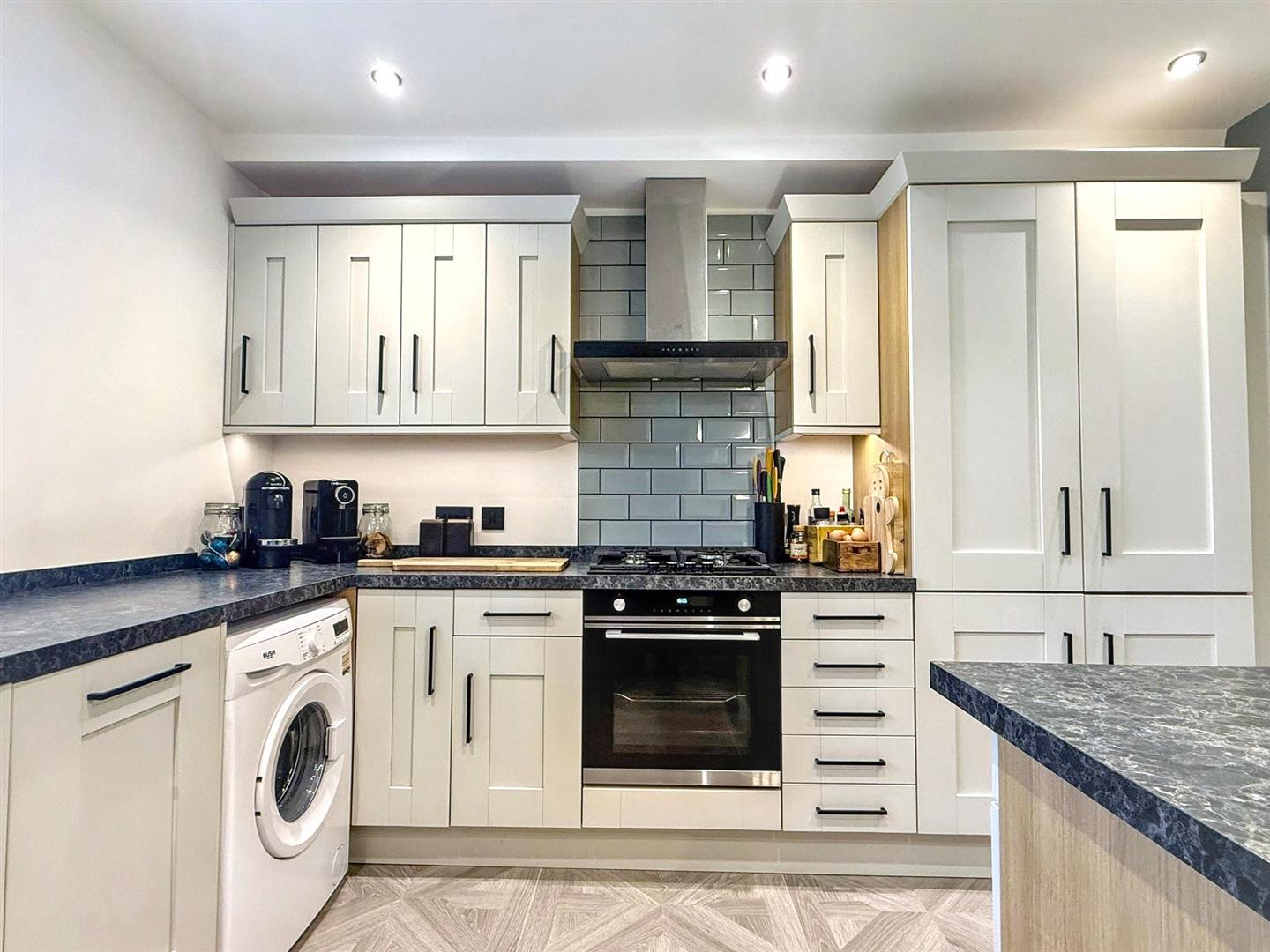 Fitted with a range of wall and base units with work surfaces over incorporatina a double stainless steel sink unit with mixer tap. Integrated four ring gas hob with extractor over, singel electric oven and dishwasher. Tiled flooring. Radiator. Space for American style fridge freezer. uPVC window to the front aspect. Inset spotlights.