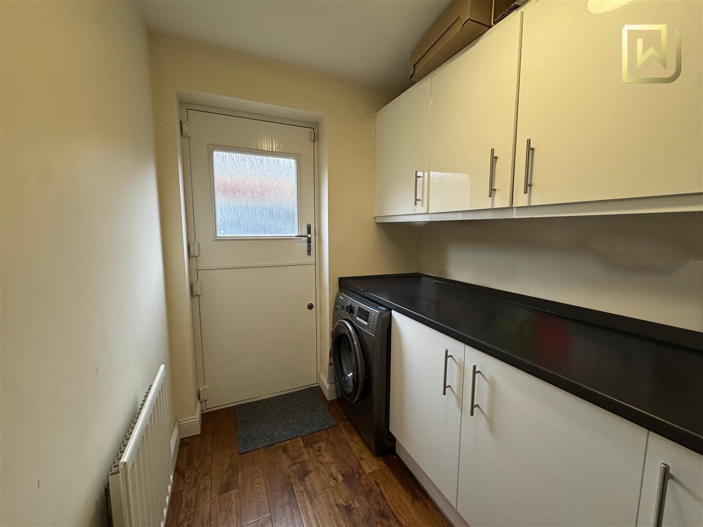 Wooden style flooring. Plumbing for washing machine. Range of wall and base units. Access to garden. Wall mounted radiator. Ceiling light.
