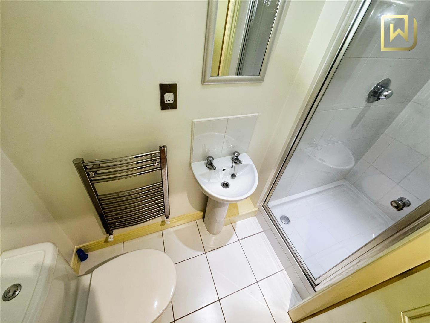 Tiled flooring. Ladder style towel rail. WC. Wash hand basin. Shower cubicle with shower attachment. Inset spotlights.