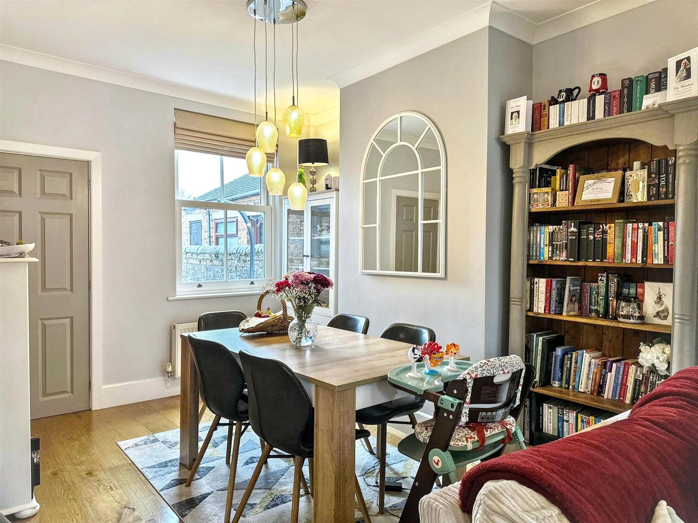 The ground floor features a generous open-plan lounge and dining area, enhanced by dual-aspect sash windows that flood the space with natural light. A feature log-burning effect electric fire provides a cosy focal point for the room. Leading from the lounge, stairs rise to the first floor, and a door opens to the rear kitchen. The kitchen is fitted with a modern range of units, integrated appliances, and inset lighting, with a convenient door providing access to the rear yard.