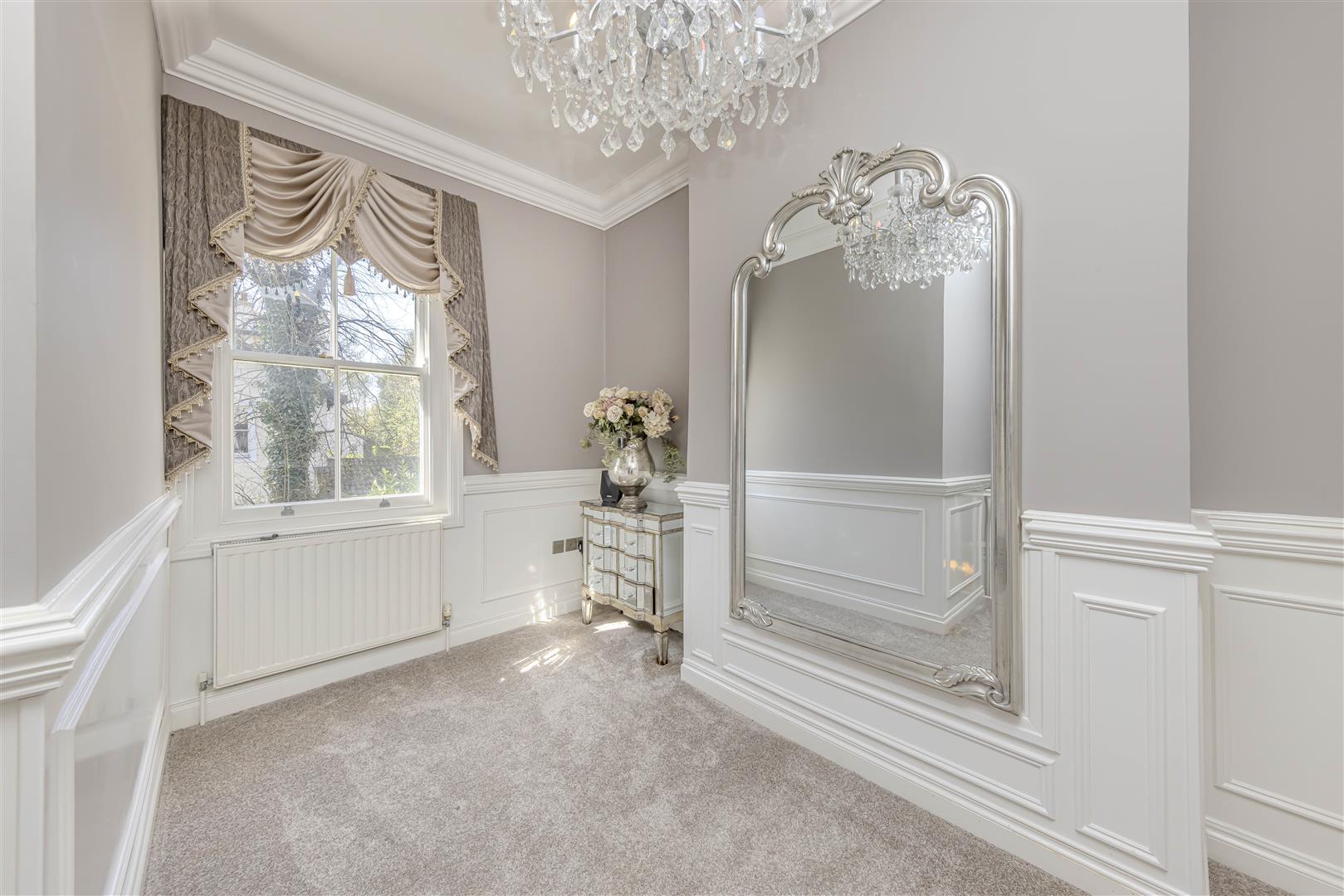 From the moment you step inside, the spacious entrance hall sets the tone, leading to two impressive reception rooms at the front of the home. These rooms showcase stunning stone mullioned arched bay windows, intricate cornicing, and period fireplaces — all hallmarks of the property’s refined heritage. The large, neutrally decorated kitchen is thoughtfully appointed with shaker-style cabinetry, a breakfast bar island, and ample space for informal dining. A useful study, second entrance hall, downstairs bathroom, and utility room complete the generous ground floor layout.