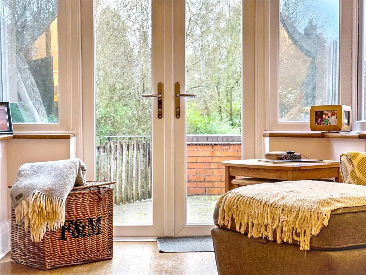 Wooden flooring. Wall mounted radiator. uPVC double glazed bay style french doors to the rear aspect. uPVC hexagon double glazed stained glass window to the side aspect. Log burner with brick surround. Four wall lights. Ceiling light.